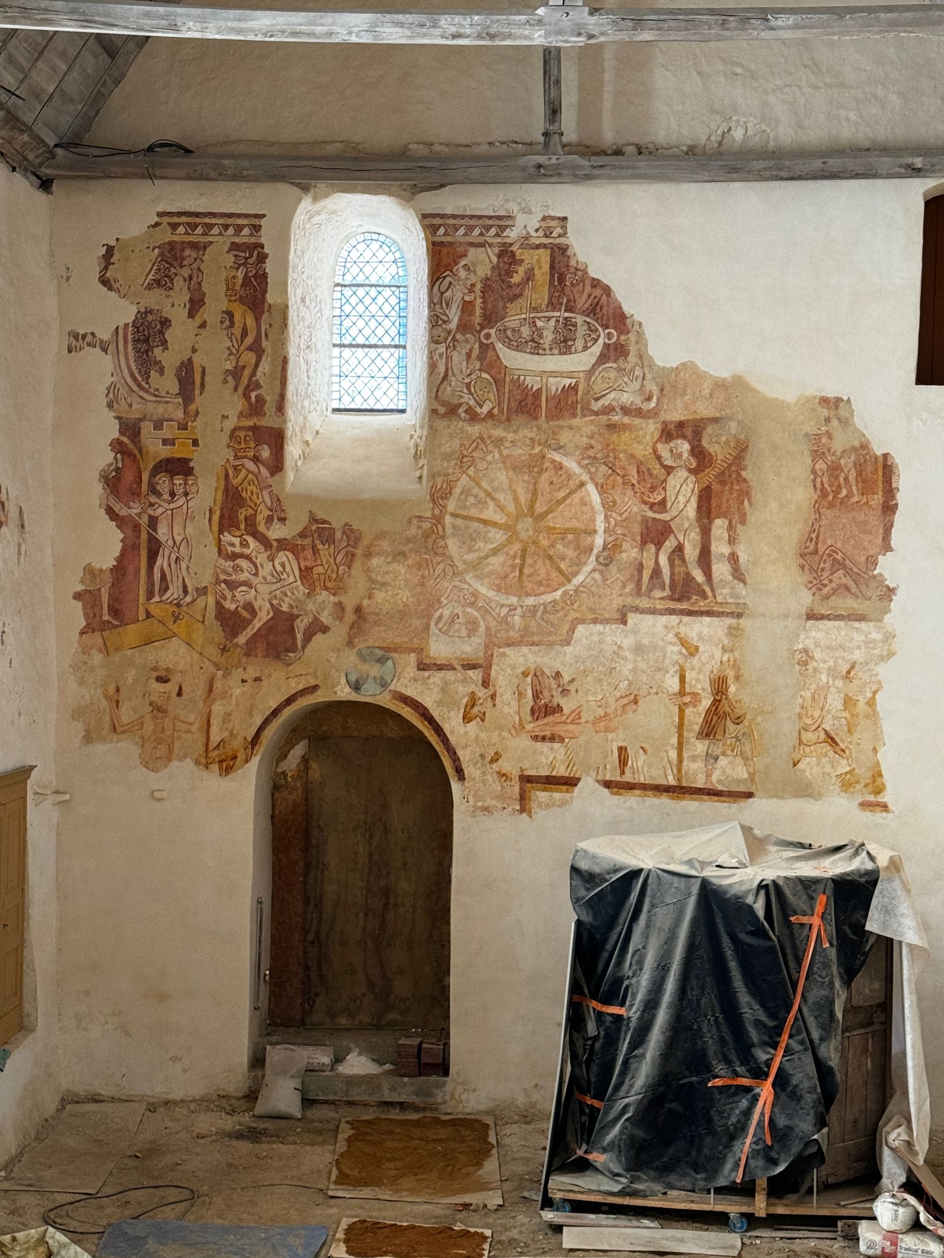 Cette opération a pour objectif principal la préservation, la restauration et l’achèvement du dégagement des peintures murales médiévales exceptionnelles de la nef et du chœur de l’église, et leur mise en valeur.
