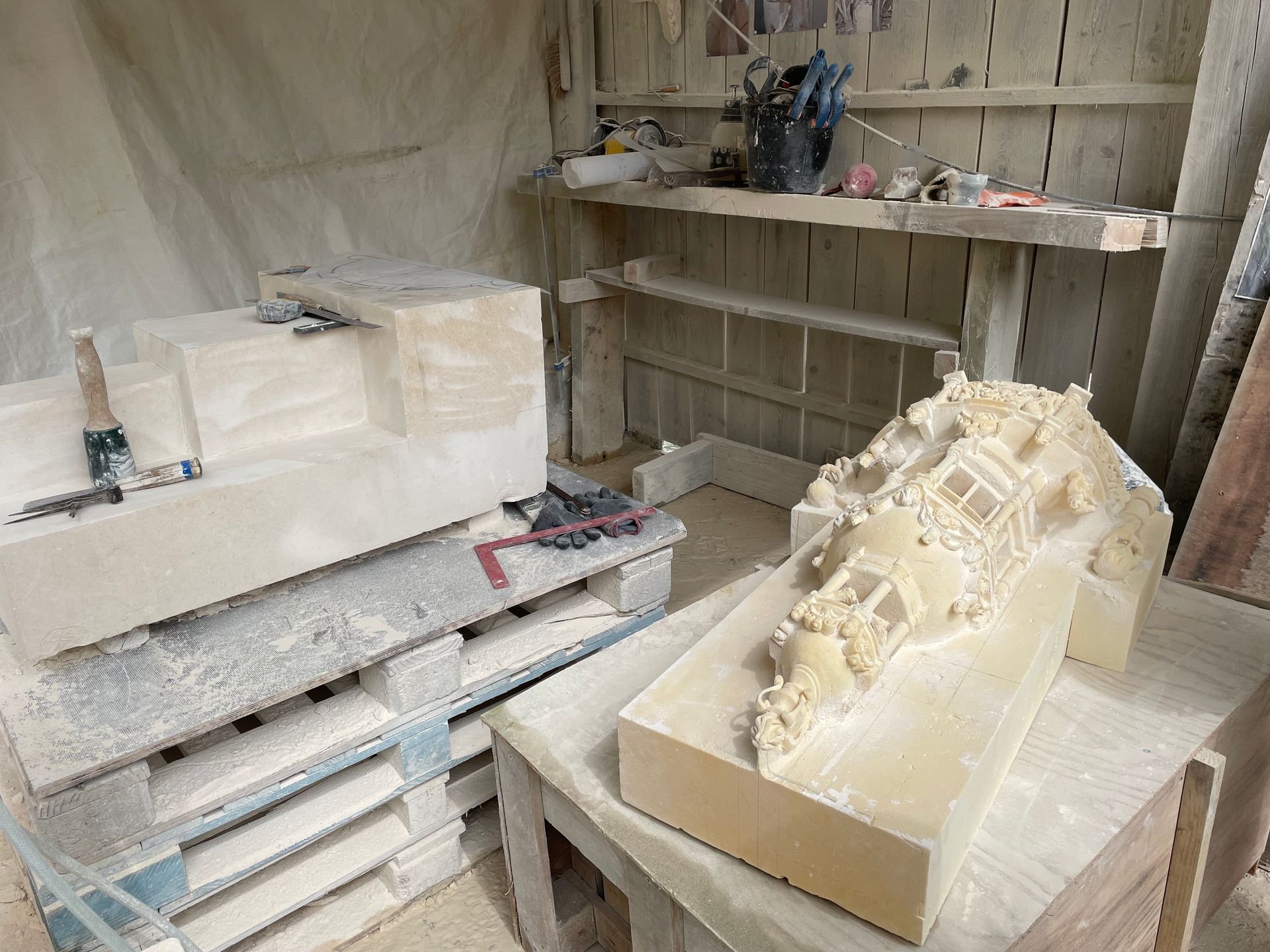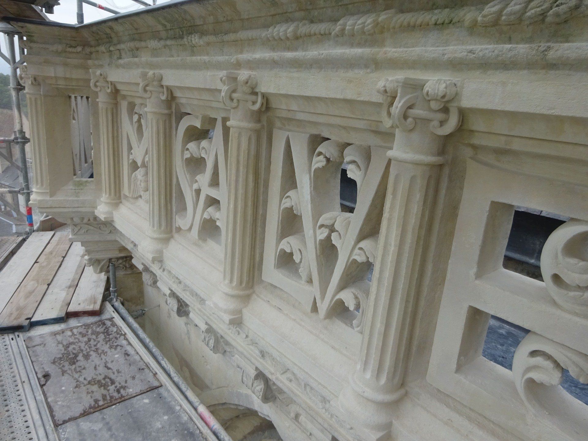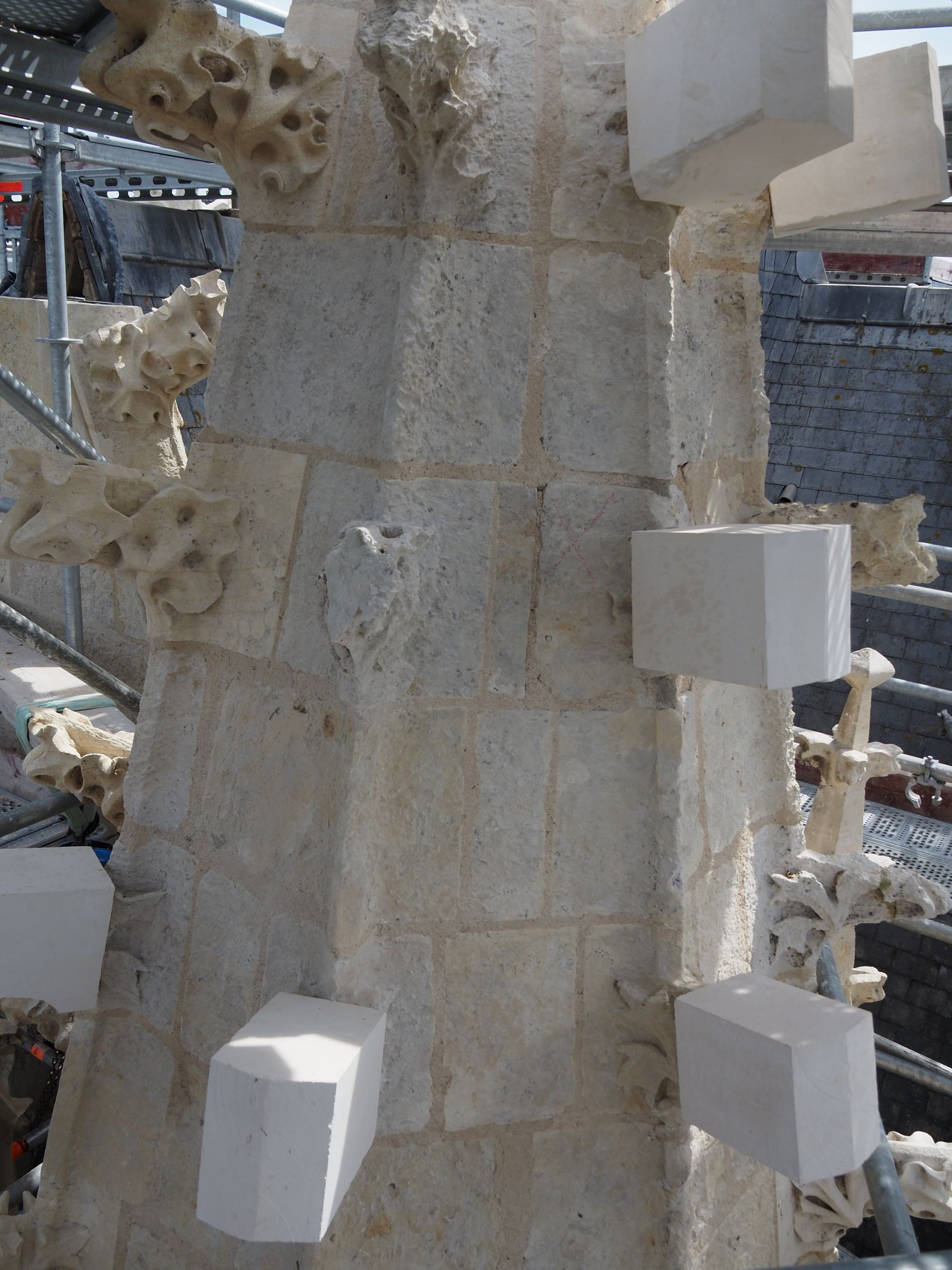 Les travaux en cours de la tranche ferme concernent le nettoyage et la restauration des décors sculptés des parties hautes des façades de l’église de Notre-Dame-des-Marais, classée au titre des Monuments Historiques en 1840 : les garde-corps, les pinacles, les arcs-boutants, les chevronnières,....