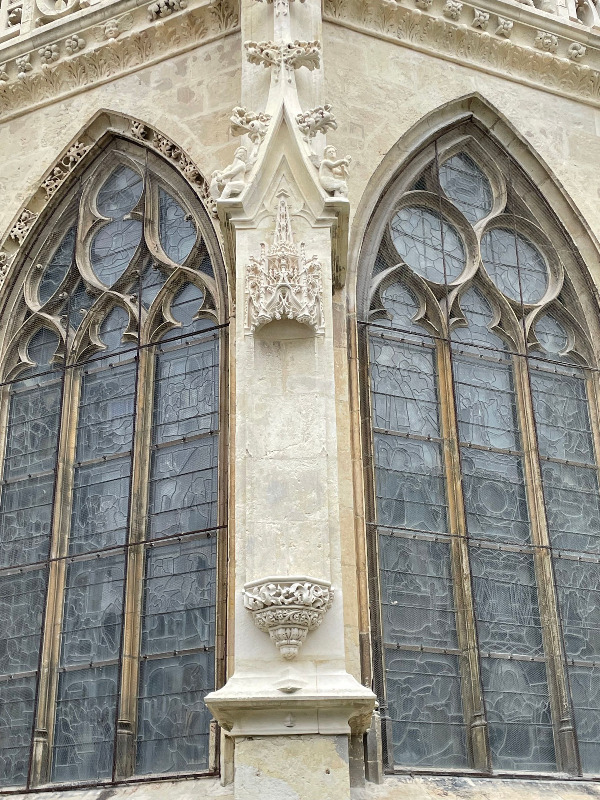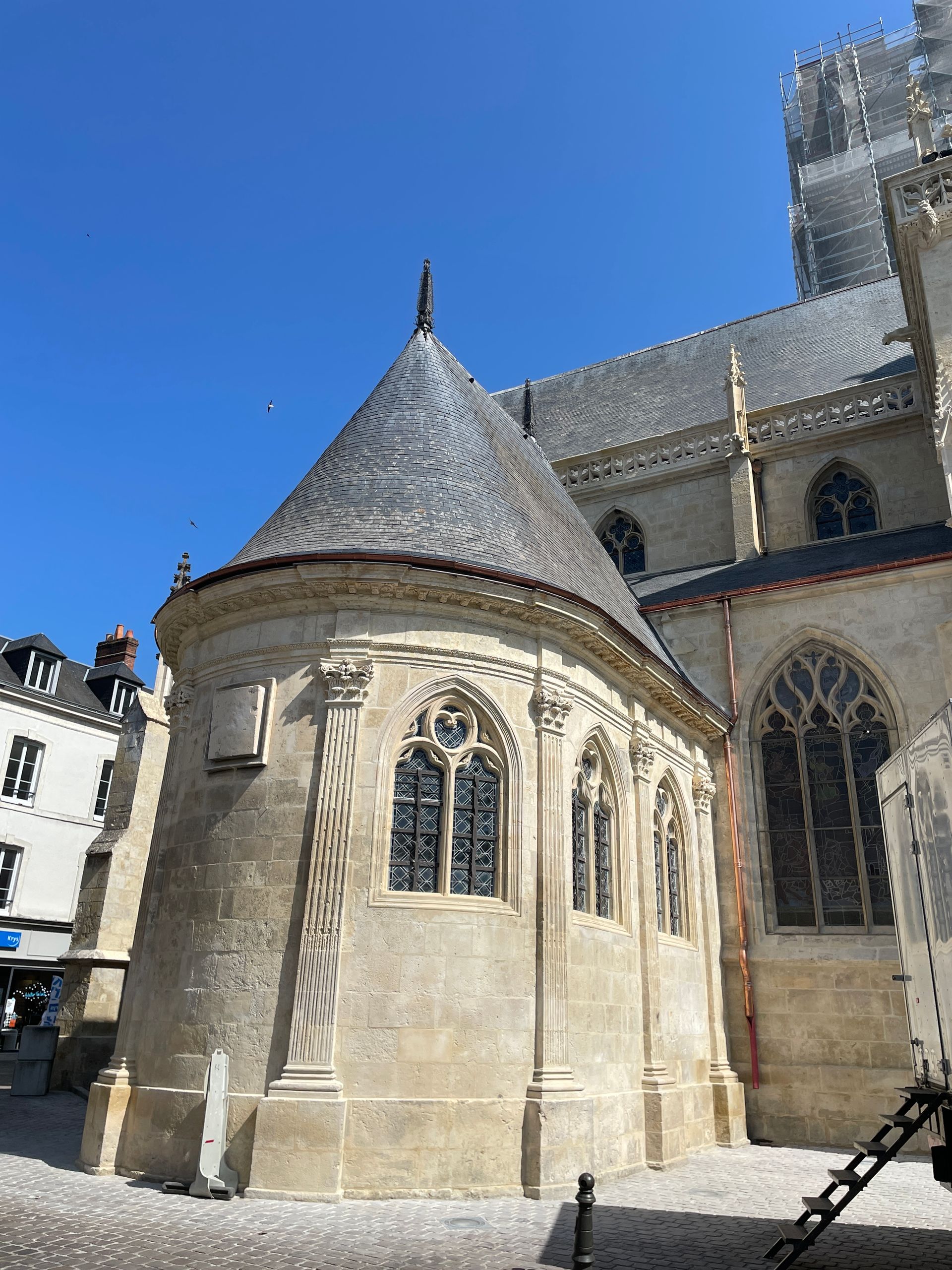 Plusieurs éléments sont aujourd’hui fissurés ou éclatés par la corrosion de goujons métalliques et constituent des risques de chutes. Les garde-corps entourant le chevet présentent un ensemble très original de lettres ornementées datant du XVIe siècle et reprenant le REGINA CAELI (partie basse) et l’AVE MARIA CAELORUM (partie haute). La façade Sud du déambulatoire comprend un ensemble de trois bas reliefs richement ornés conservant des vestiges de peintures polychromes et de décors ciselés en contraste, à la manière de la technique italienne très délicate du sgraffito, et que l’on peut observer dans un état plus complet sur les voûtes intérieures des chapelles rayonnnantes du chevet.