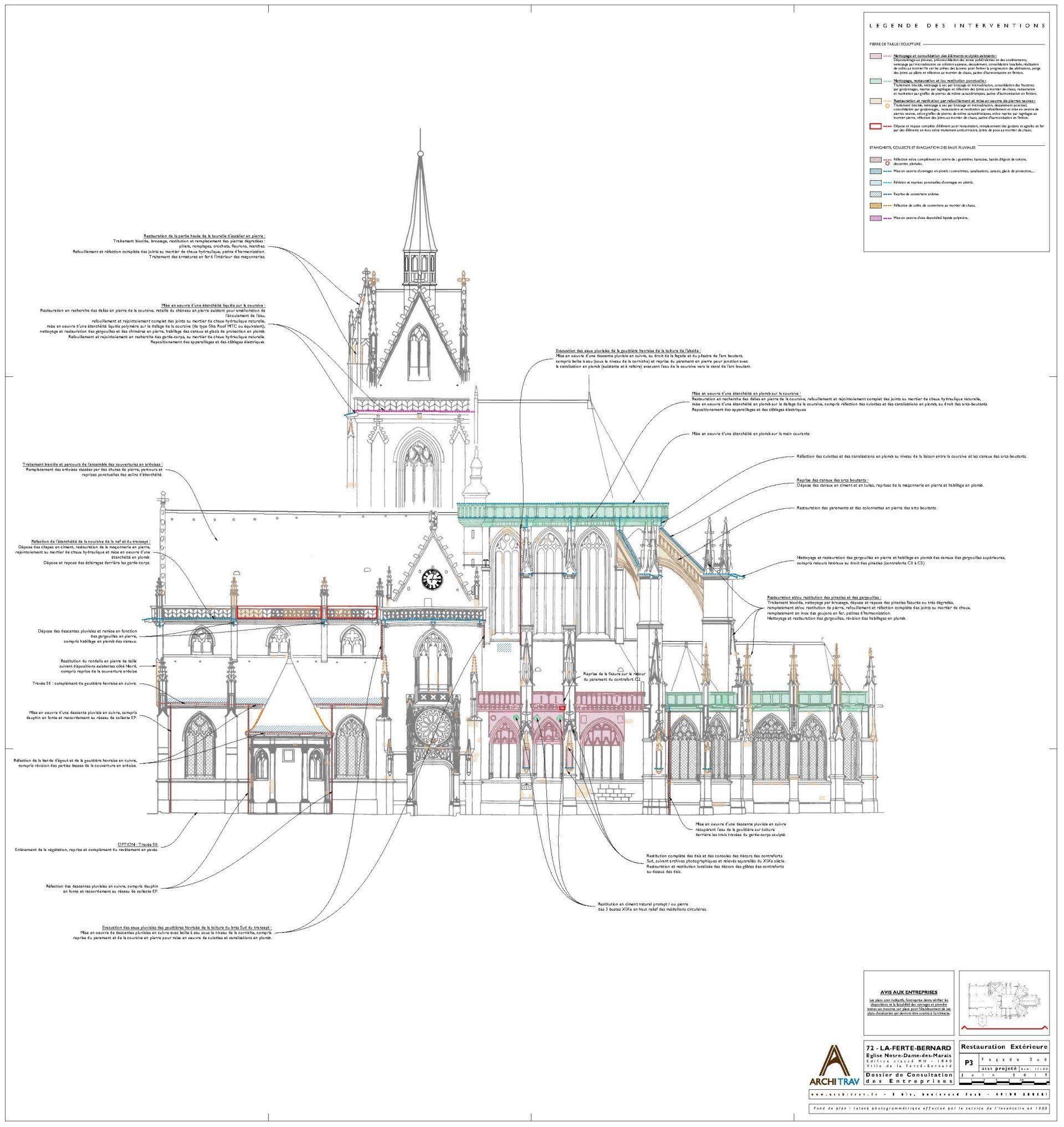 Le phasage fonctionnel des travaux s’organise suivant une tranche ferme traitant en priorité les parties hautes de l’abside et l’étanchéité de la coursive, puis de quatre tranches conditionnelles traitant le reste de l’édifice au regard des priorités d’intervention.