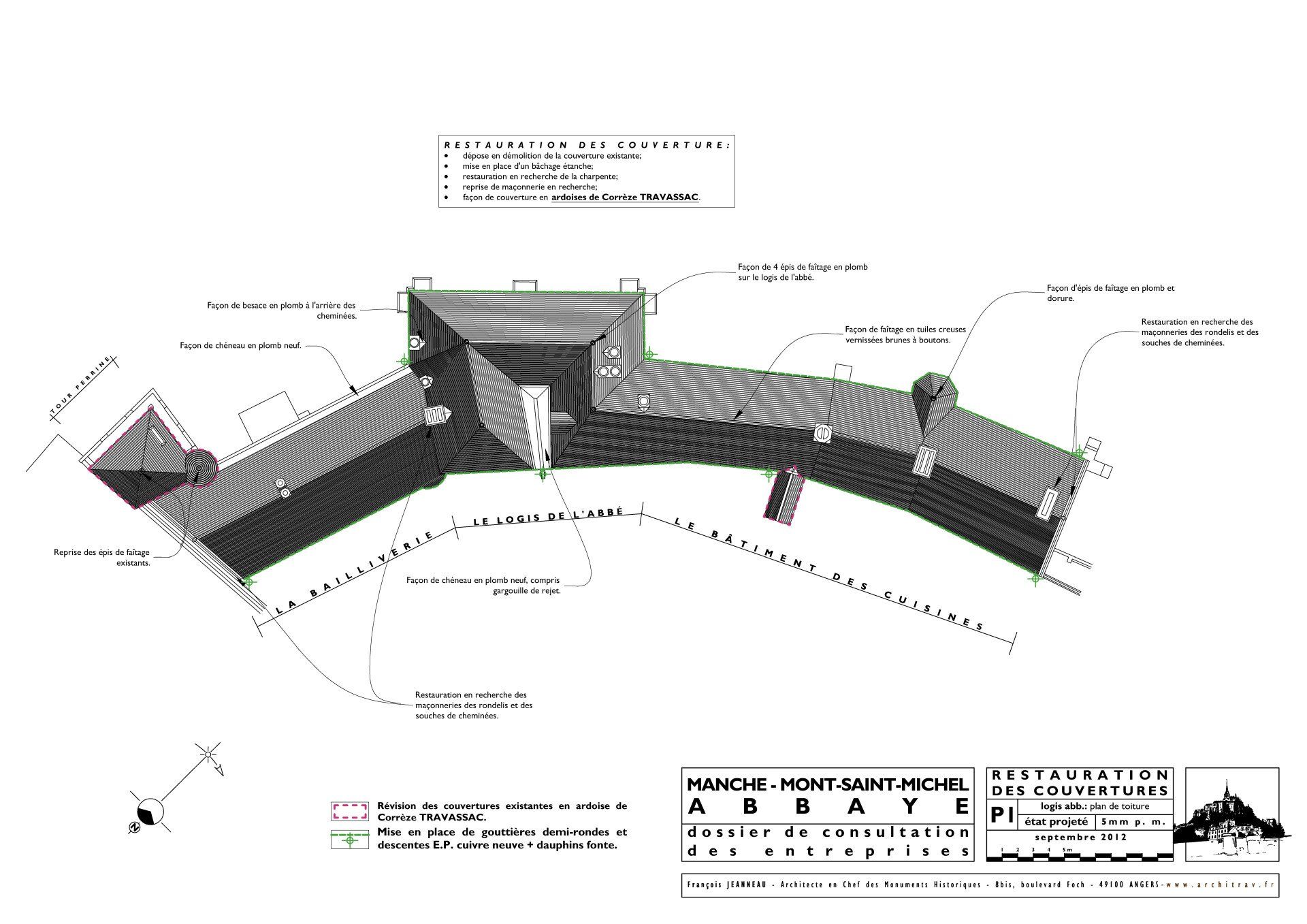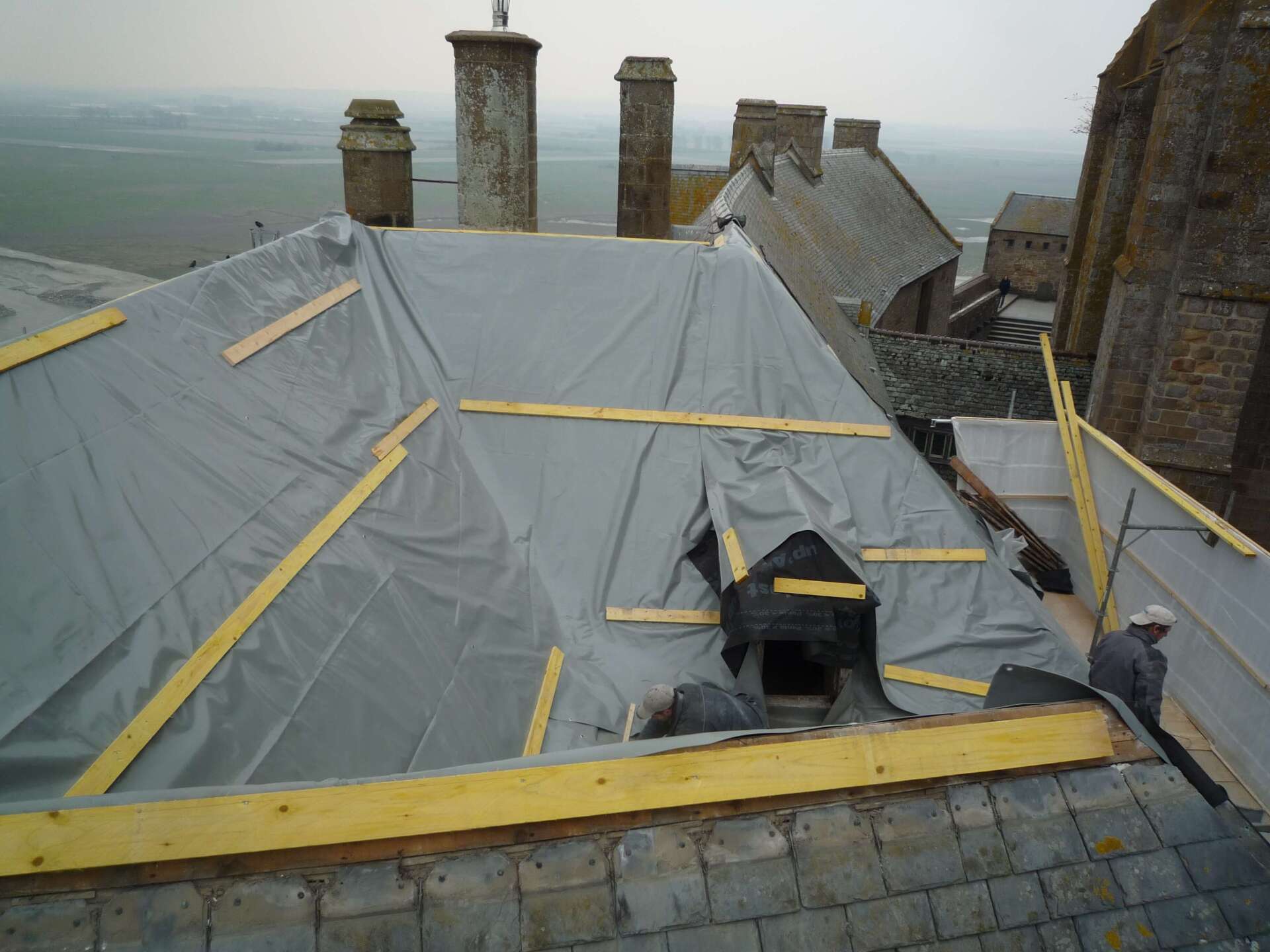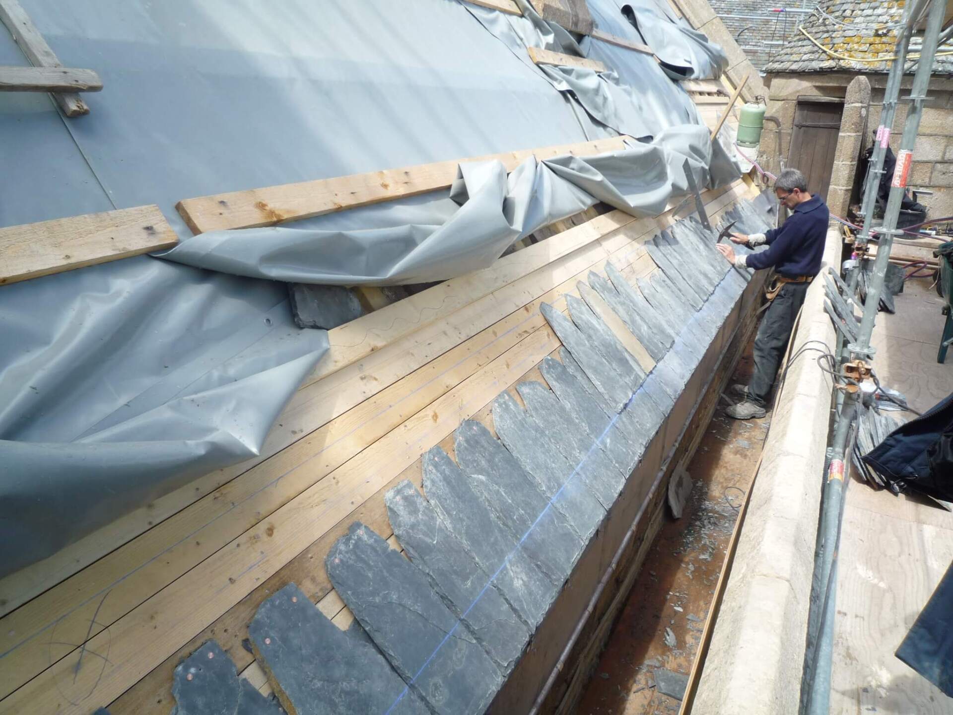 À l’instar de ce que nous avons fait à l’église abbatiale, nous avons fait refaire les couvertures des logis en ardoises épaisses de Corrèze-Travassac sur l’ensemble des logis. C’est le matériau qui s’approche le mieux des ardoises de Sizun ou de Locquirec, autrefois utilisées et dont l’extraction est aujourd’hui terminée. Ces ardoises épaisses de plusieurs dimensions permettent une pose à liaisons brouillées et pureaux décroissants, mode de pose traditionnel se rapprochant des techniques anciennes.