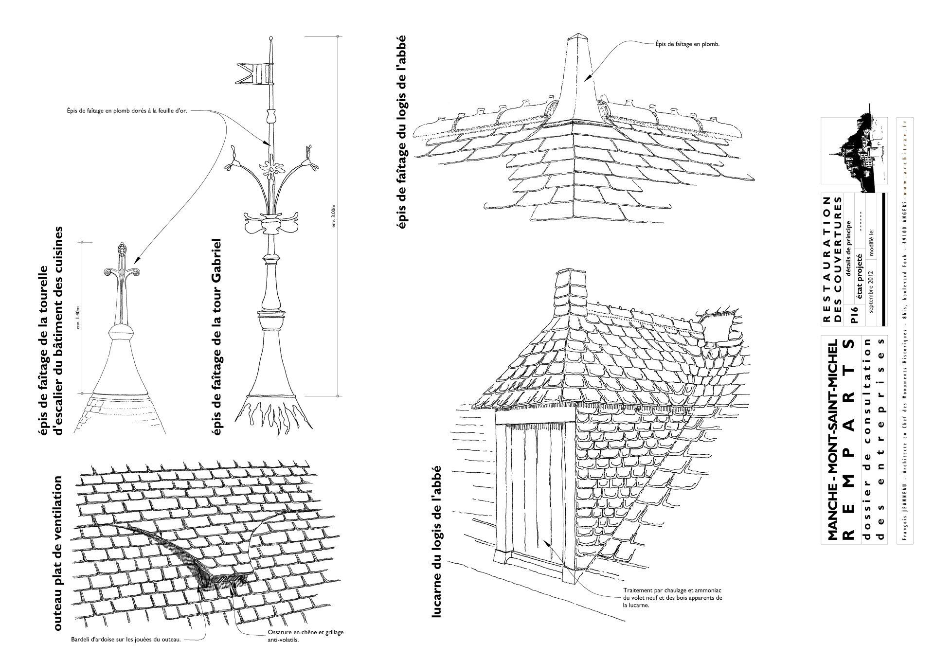 La couverture de la tour Gabriel en ardoise fine posée aux crochets, vieille de plus d’un siècle, a été refaite en ardoise de 4/5 mm d’épaisseur (modèle Armor d’Angers-Trélazé) posée aux clous. L’ardoise proposée, légèrement plus épaisse que celle mise en œuvre par Corroyer, devrait être plus durable sur un ouvrage ici très exposé. Les outeaux ayant la forme de petite lucarne ont été maintenus, respectant ainsi la restauration précédente.