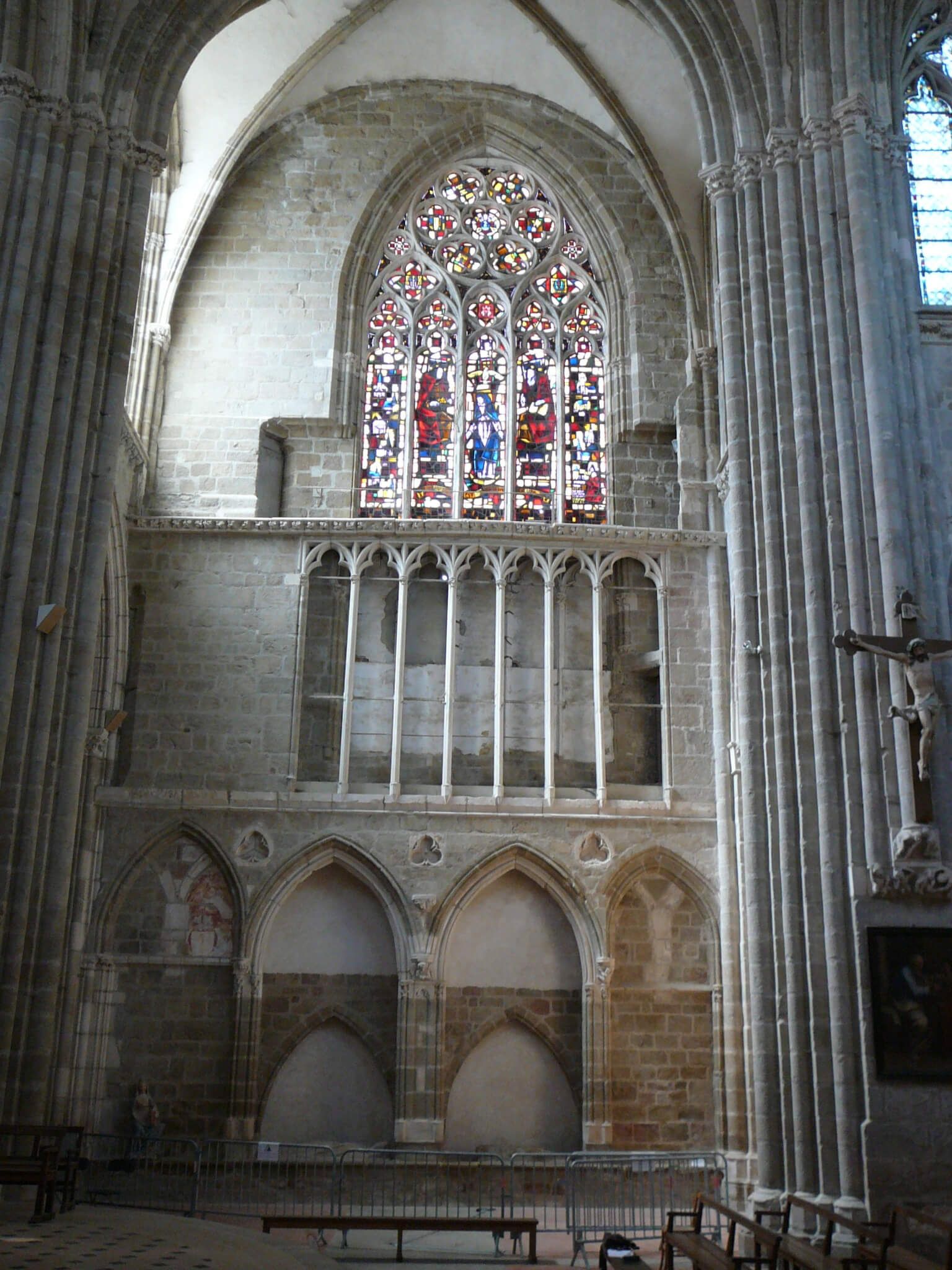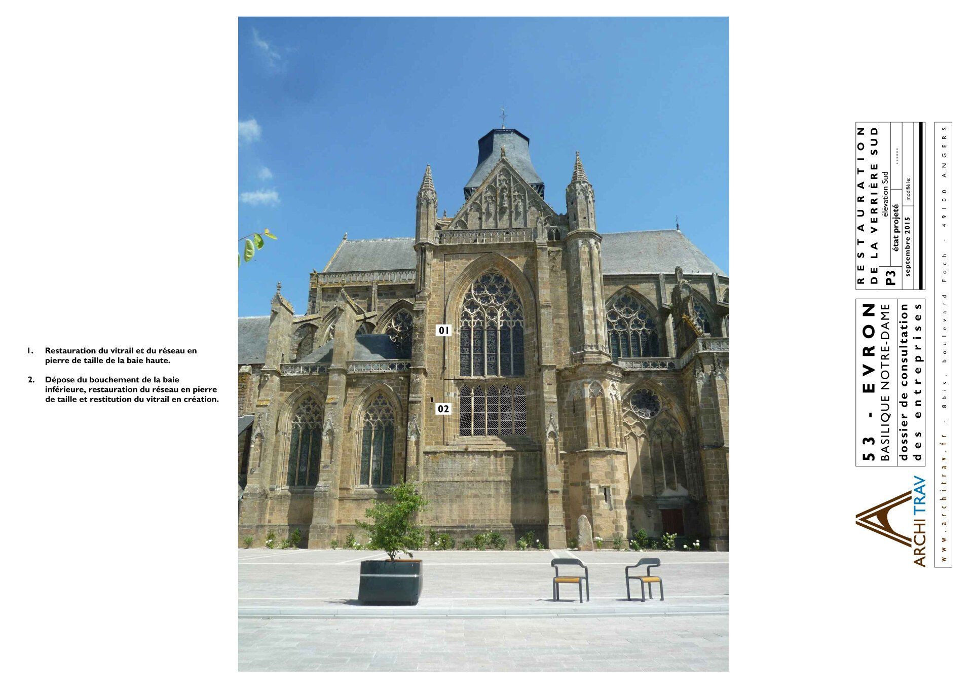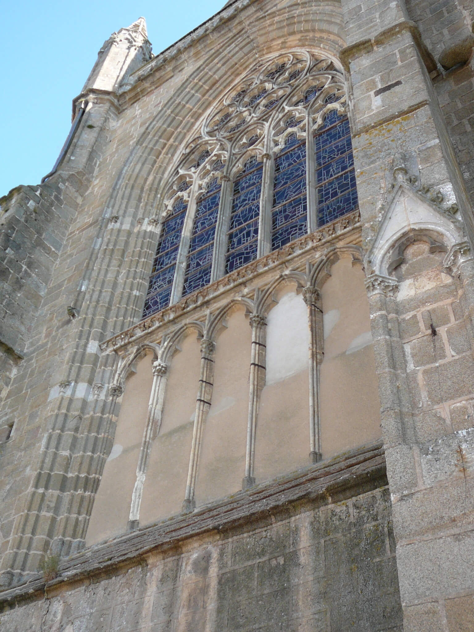 - La restauration du réseau en pierre de taille de la baie supérieure en granit roux de Louvigné et en pierre de Lavoux veiné, en remplacement de la pierre de Bernay utilisé au Moyen Âge.
