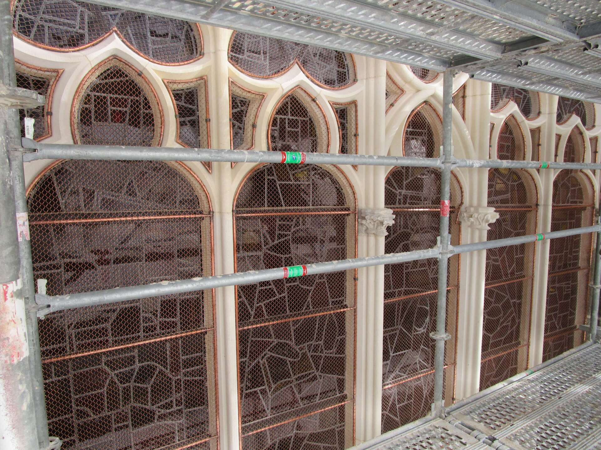 Les présents travaux avaient pour objet la réouverture des parties basses de cette verrière Sud du bras Sud du transept. Ils ont consisté en :