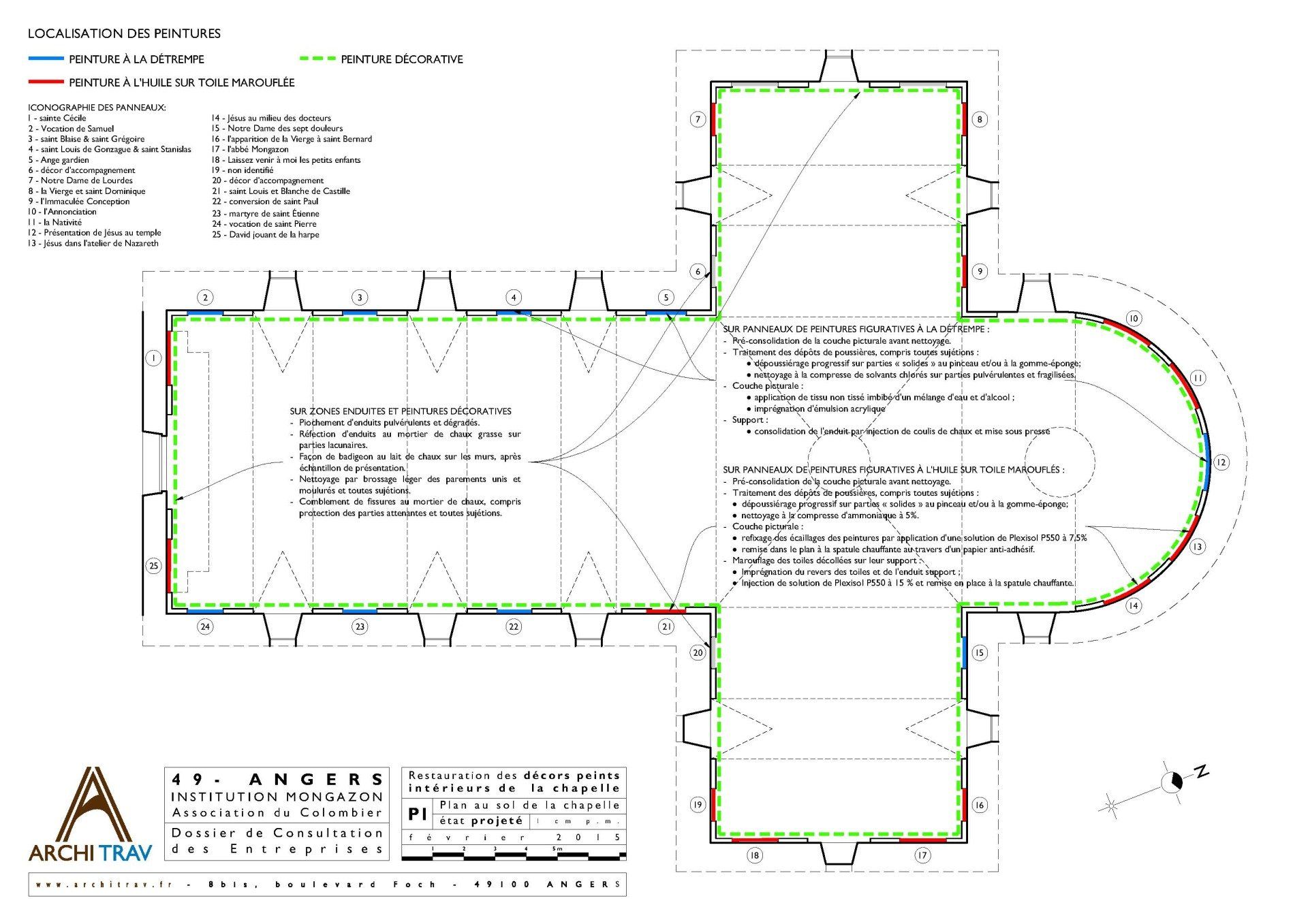 Les travaux qui en découlent consistent donc en la réfection de la toiture et de son étanchéité, ainsi qu'en la restauration des décors muraux de la chapelle. Trois natures de peinture ont été dissociées :