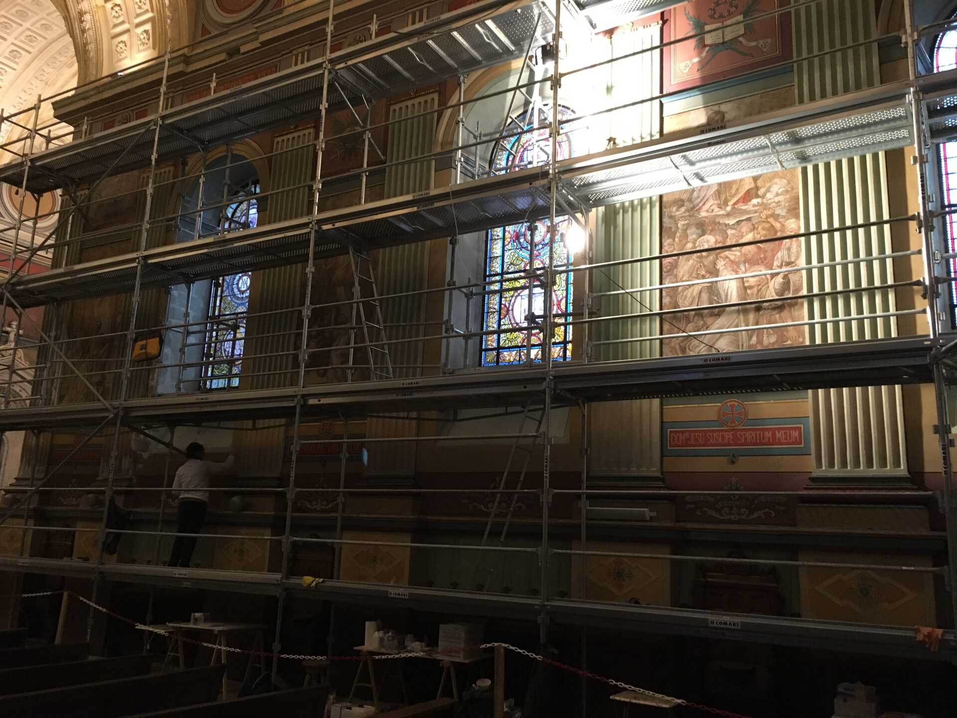 Selon leur nature, ces différents décors ont été restaurés par nettoyage, consolidation et réintégration par un restaurateur de peintures spécialisé.