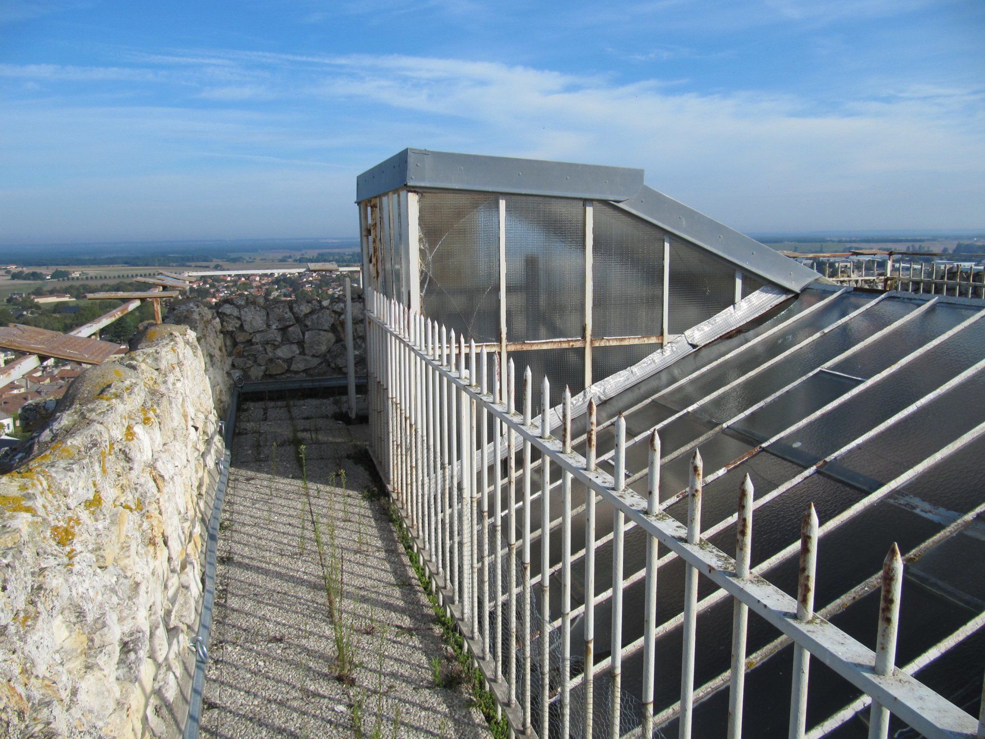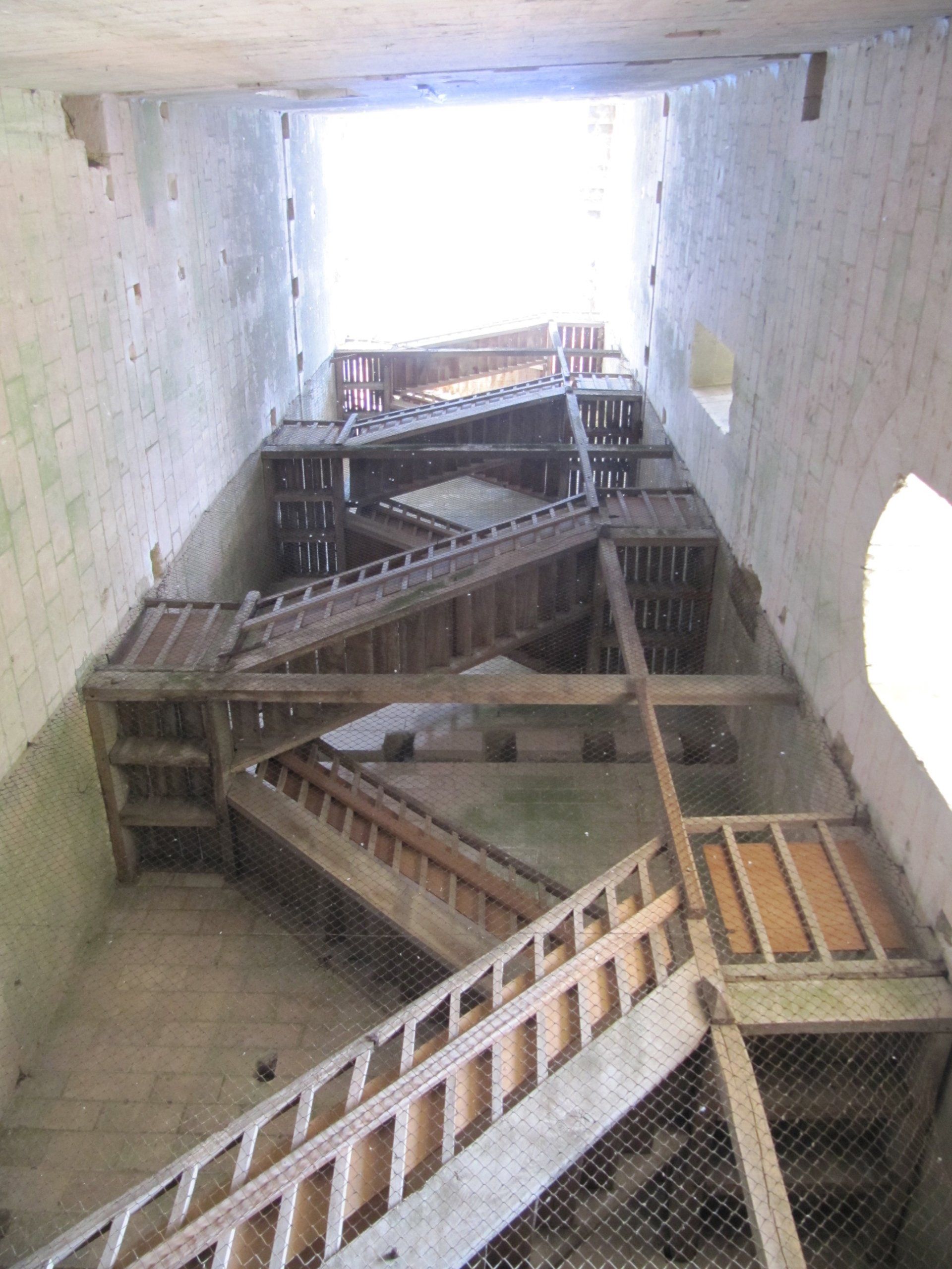 À l’extérieur, un ouvrage rapporté comprenant un escalier en bois et une passerelle a été créé pour permettre l’accès à la porte haute de la façade Est.