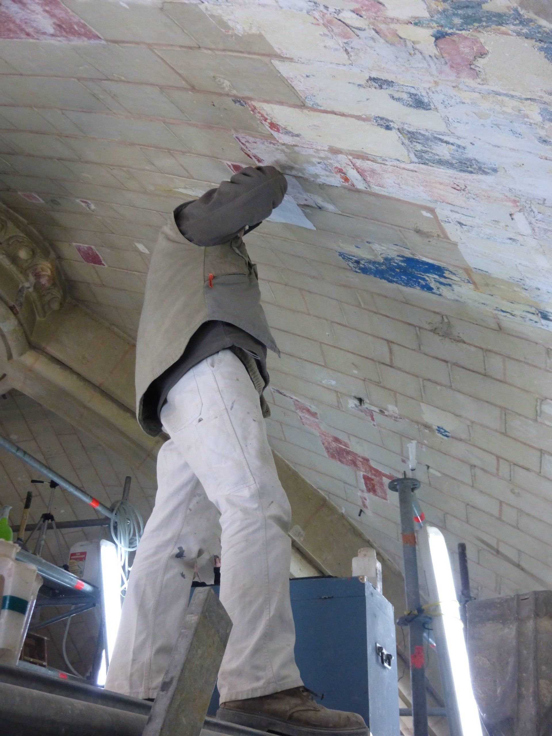 Les travaux ont porté sur le dégagement des peintures couvrant les voûtains et les murs au-dessus de la coursière, ainsi qu’à leur consolidation, leur restauration et au traitement des lacunes.