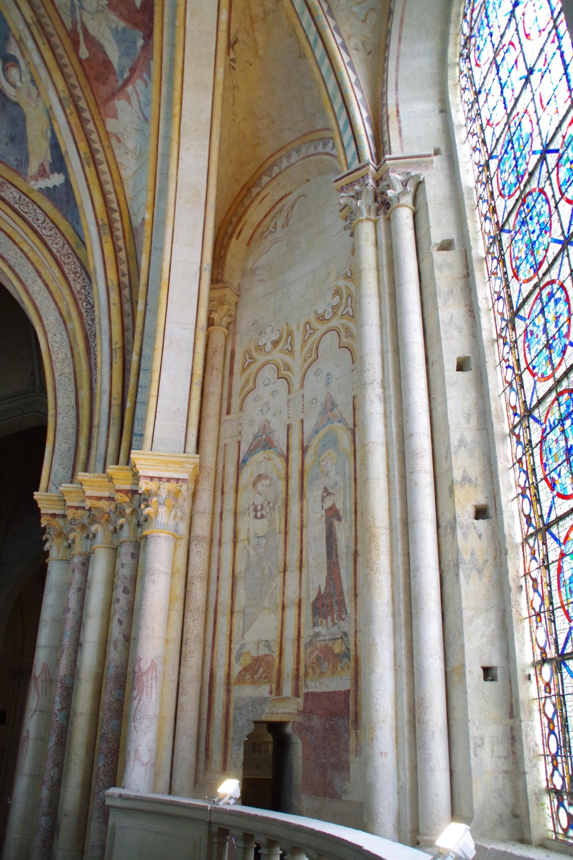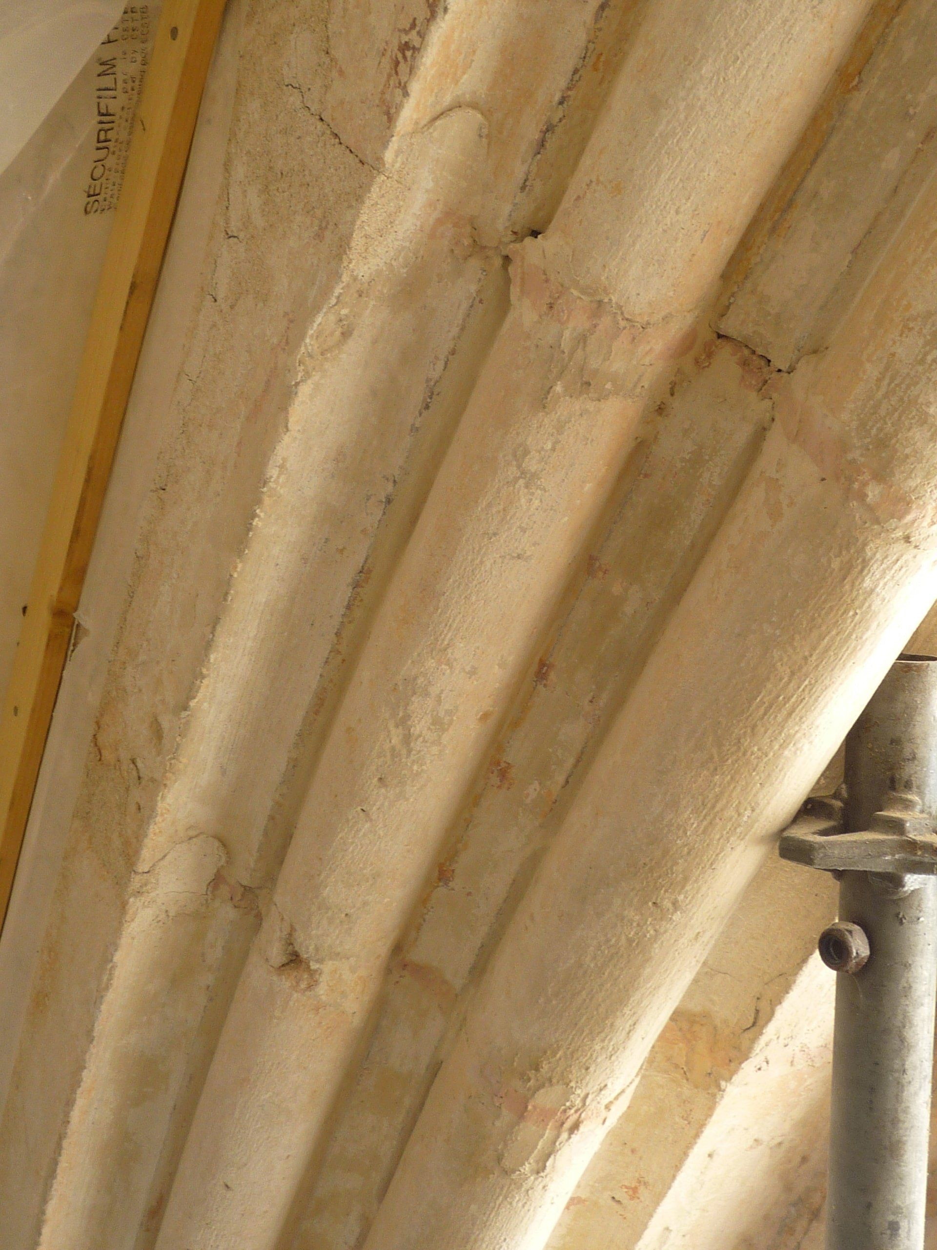 Lors de la restauration des vitraux, des sondages sont effectués au niveau des enduits beige du XVIIIe siècle dans le pourtour des bais.