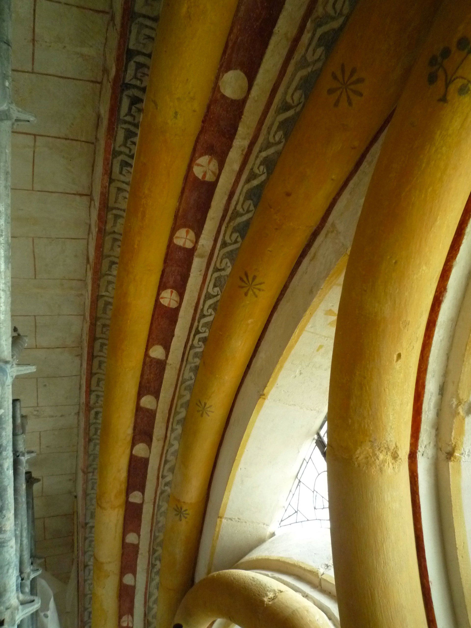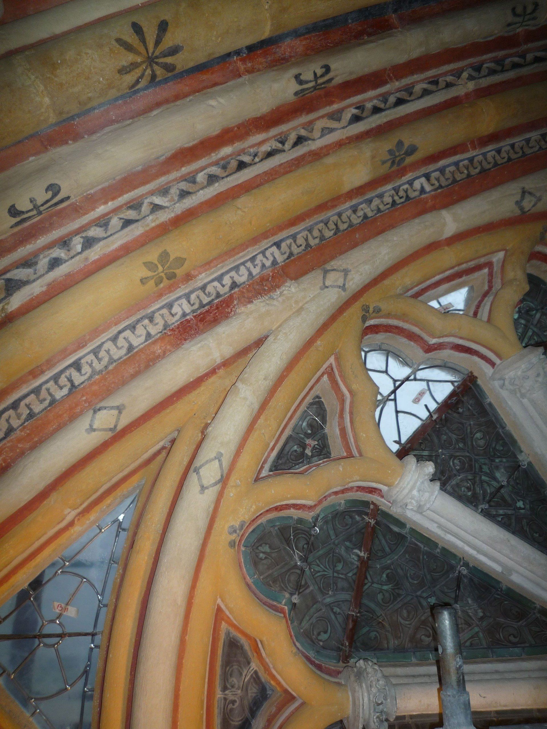 Au niveau des baies 19 à 22 (deux premières travées de la nef), ces sondages se montrent concluants. Entre juillet 2012 et mai 2013, des travaux dégagement et de restauration des décors peints sont alors réalisés mettant au jour un décor colorés mettant en valeur l'architecture.