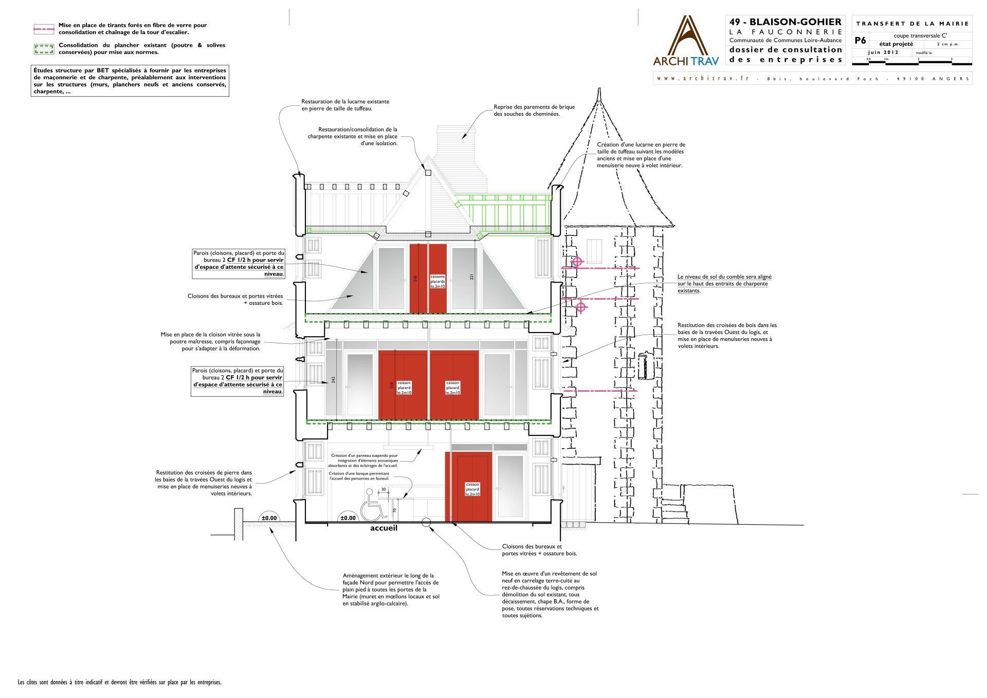 Les travaux d’aménagement consistent en la création d’un accueil avec bureau, du bureau du maire et d’une salle de conseil, ainsi que de sanitaire au RDC ; de trois bureaux au premier étage et d’un bureau fermé avec une grande salle au niveau des combles. Le RDC répond aux normes des établissements recevant du public (ERP).