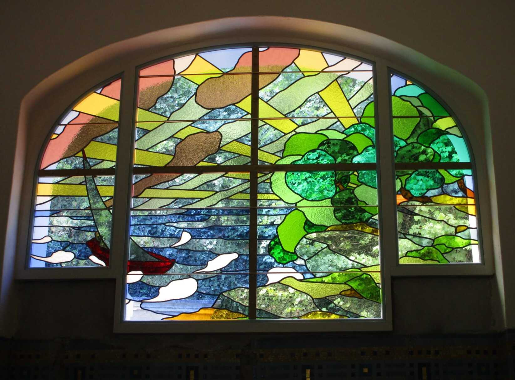- la restauration des façades : nettoyage des parements en pierre de taille, traitement, brossage et changement à neuf des éléments de pierre altérés en façade Est, réfection à neuf des enduits sur les autres façades, compris la restitution de la baie d’axe dans son gabarit d’origine avec la remise en place de son vitrail selon les cartons de Ludovic Alleaume.