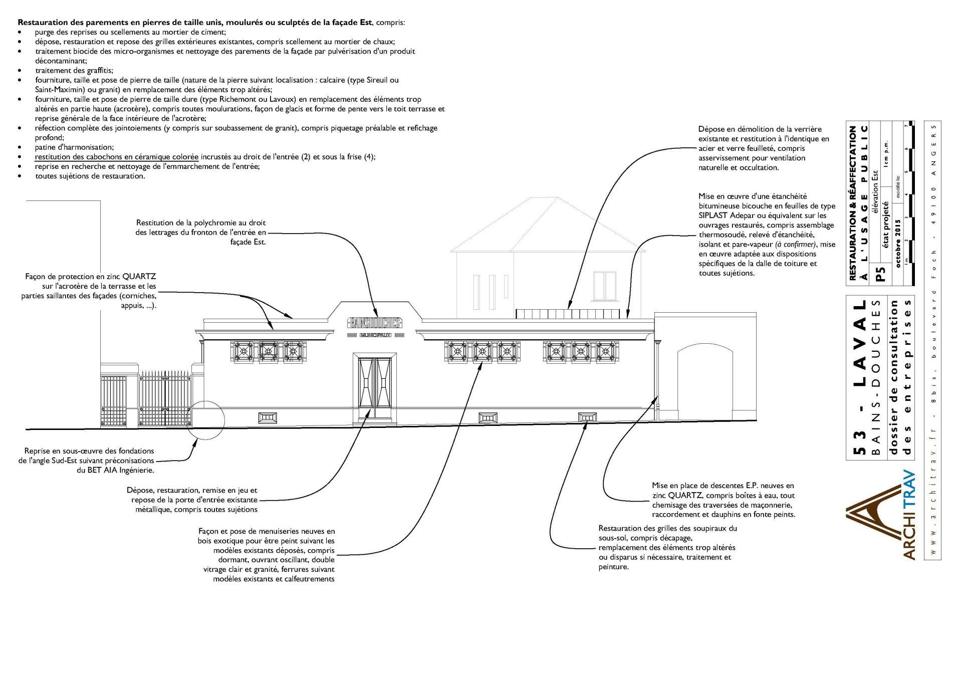 Le chantier porte sur la restauration du bâtiment des Bains-Douches de Laval. Il s’agit à la fois de redonner à ce témoin de l’architecture des années 20, les conditions de sa conservation au vu des importantes altérations qu’il présente, mais aussi d’en permettre la réouverture au public selon une nouvelle vocation à usage culturel souhaitée par le Ville maître d’ouvrage : organisation d’expositions temporaires ou petits concerts...