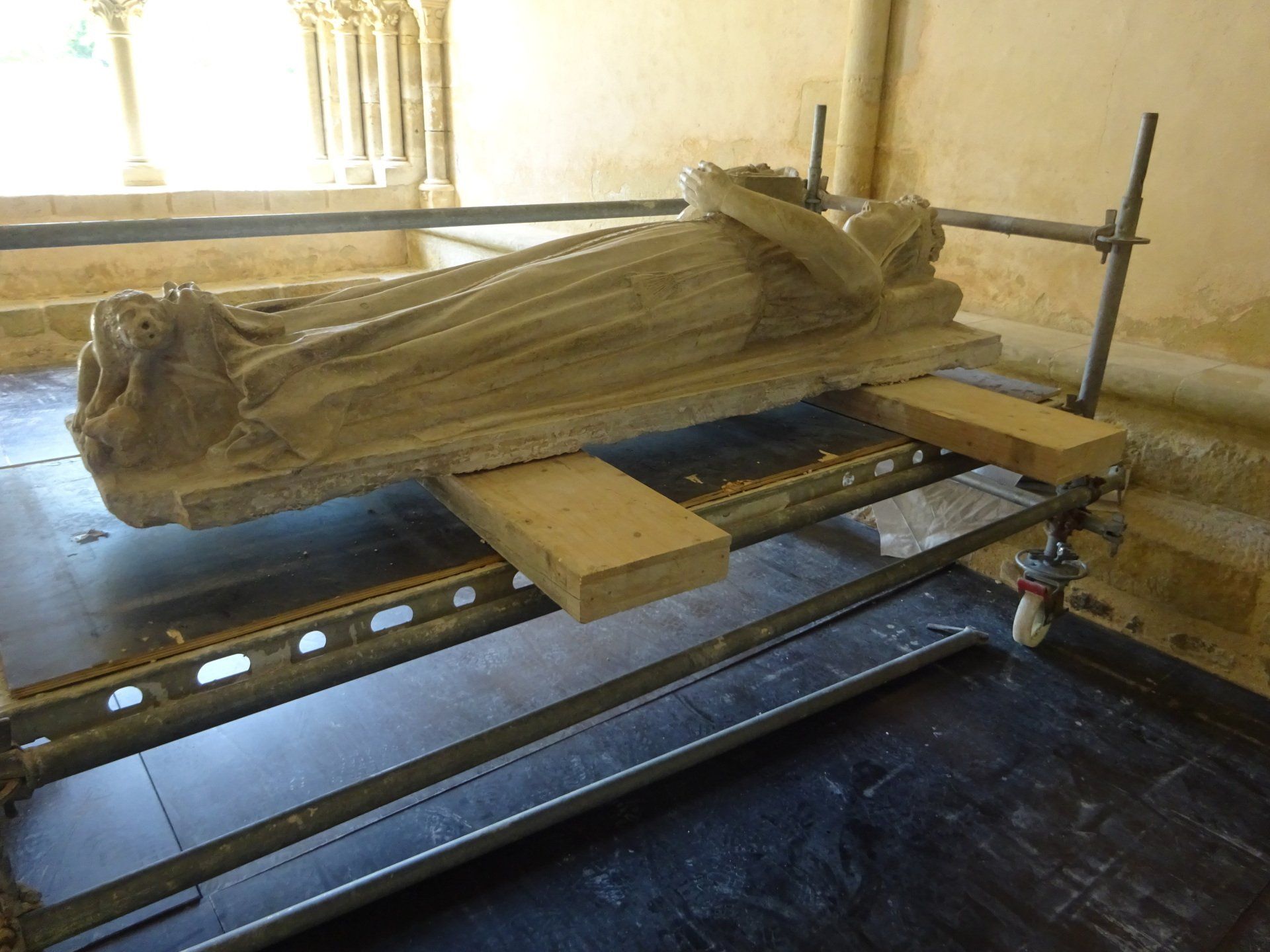 C'est à la suite d'un important travail de recherche et d'études historiques et archéologiques en amont pour documenter la connaissance du gisant, que le département de la Sarthe a demandé au cabinet Architrav le déplacement du gisant dans le chœur de l'église abbatiale, où sont traditionnellement inhumés les fondateurs d'une abbaye.