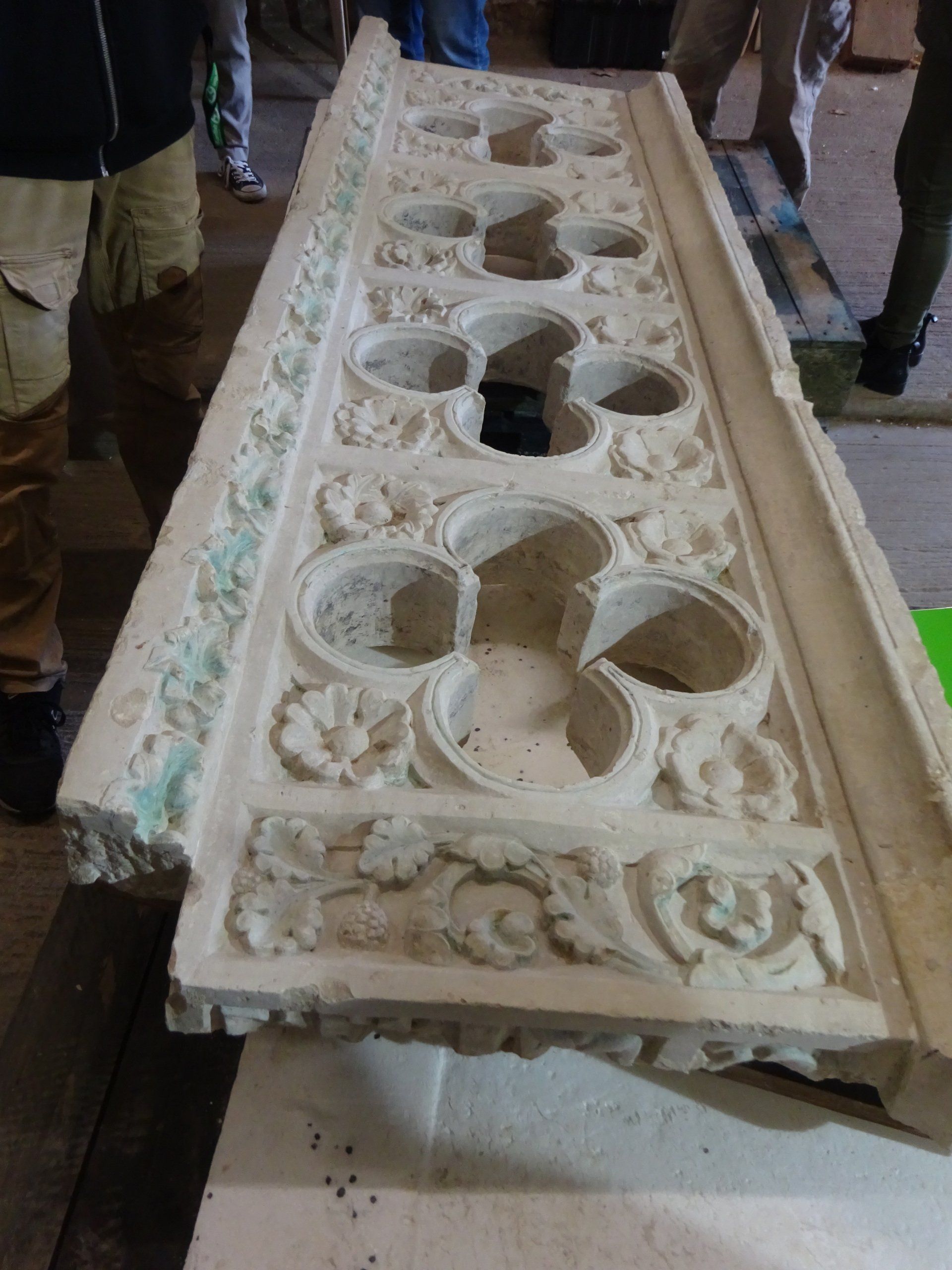 Le remontage du tombeau comprend la réintégration de trois panneaux sculptés en pierre du coffre constituant le socle du gisant. Retrouvés récemment dans le dépôt lapidaire du site de l’abbaye, et après analyses d’échantillons de pierre en laboratoire, ils ont été authentifiés comme datant de la réalisation du gisant.