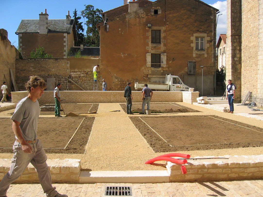 En complément des travaux de restauration et d’aménagement intérieur du bâtiment conventuel, nous avons aménagé l’aire du cloître et créer un jardin de parterres bordés de buis, entouré de murets bas, reprenant l’emprise du cloître.