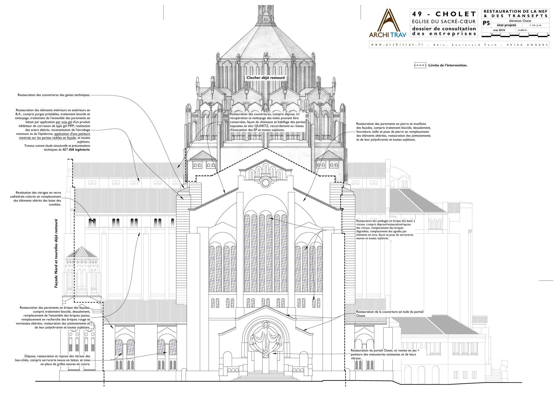 - Phase 2 (2018-2022) : La restauration de la nef, et des bras de transept comprenant le nettoyage des combles, la restauration des bétons extérieurs et intérieurs (combles) par purge, traitement des aciers et des bétons et complément des manques, la reprise des enduits et mise en peinture, la restauration des jambages, meneaux et parements en briques, la restauration des parements en moellons intérieurs des combles, la réfection à neuf des glacis, la restauration des charpentes et couvertures et la restauration des vitraux.
