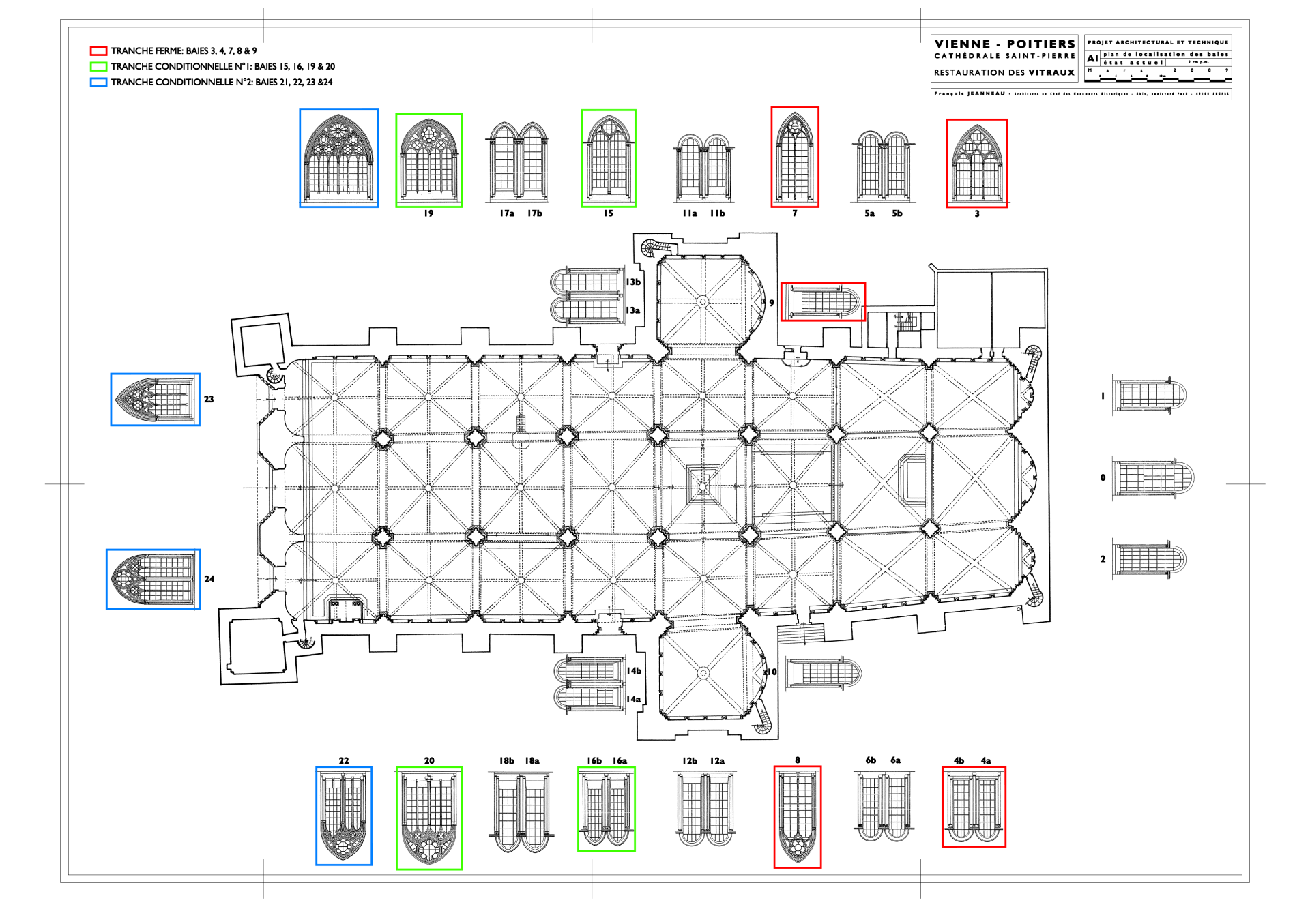 Conduits à partir de septembre 2009, les travaux de restauration des vitraux de la cathédrale de Poitiers ont été réalisés en trois tranches et ont distingué des opérations de restauration et de création :