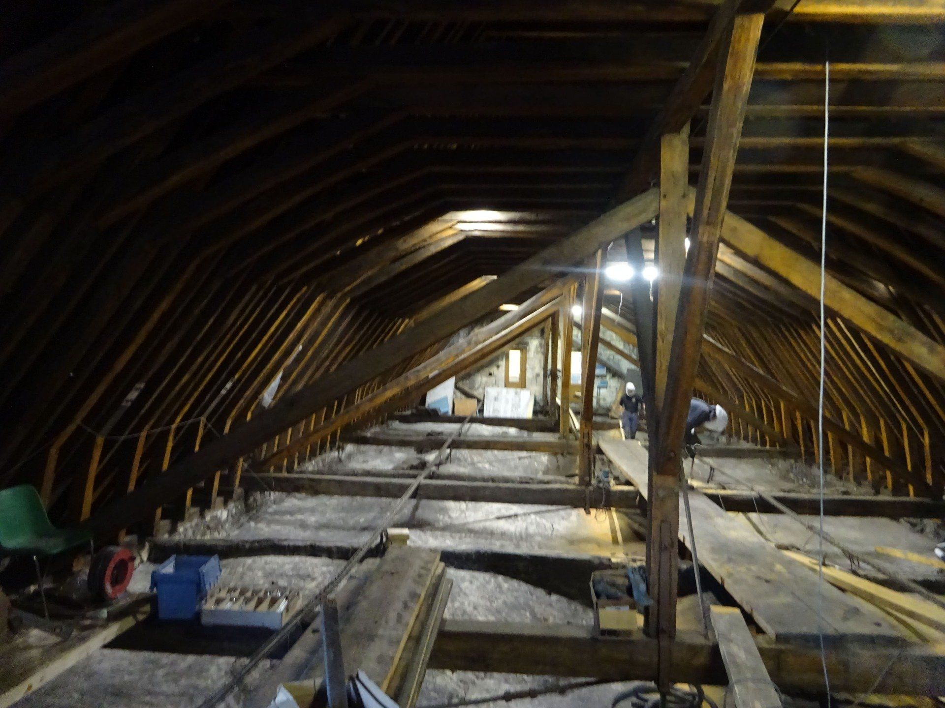Ces interventions ont été accompagnées par une restauration partielle de la charpente aujourd’hui fragilisée. Dans le prolongement de ces travaux, la consolidation par chaînage des angles Sud-Ouest et Nord-Ouest du bâtiment a été réalisée.