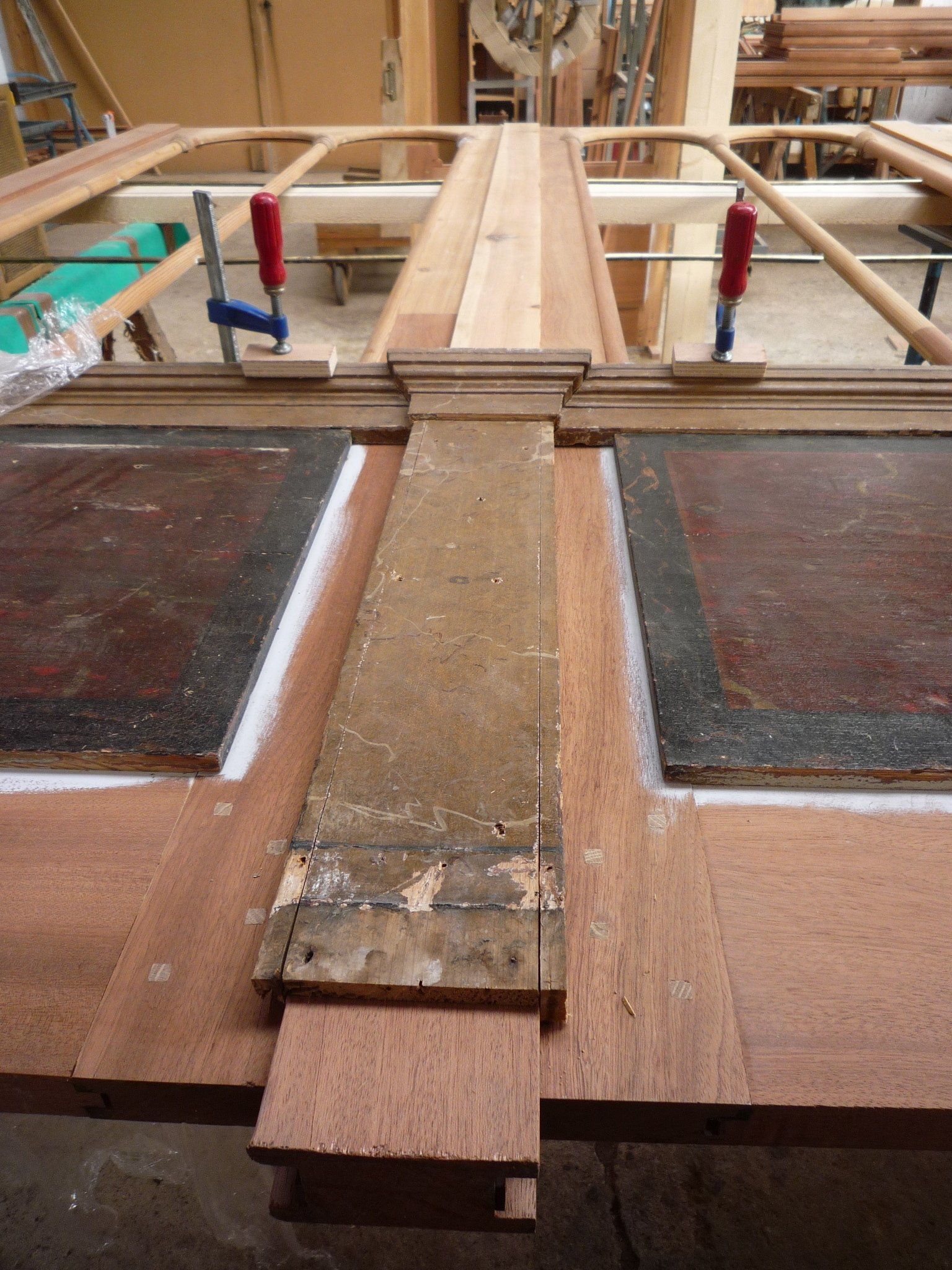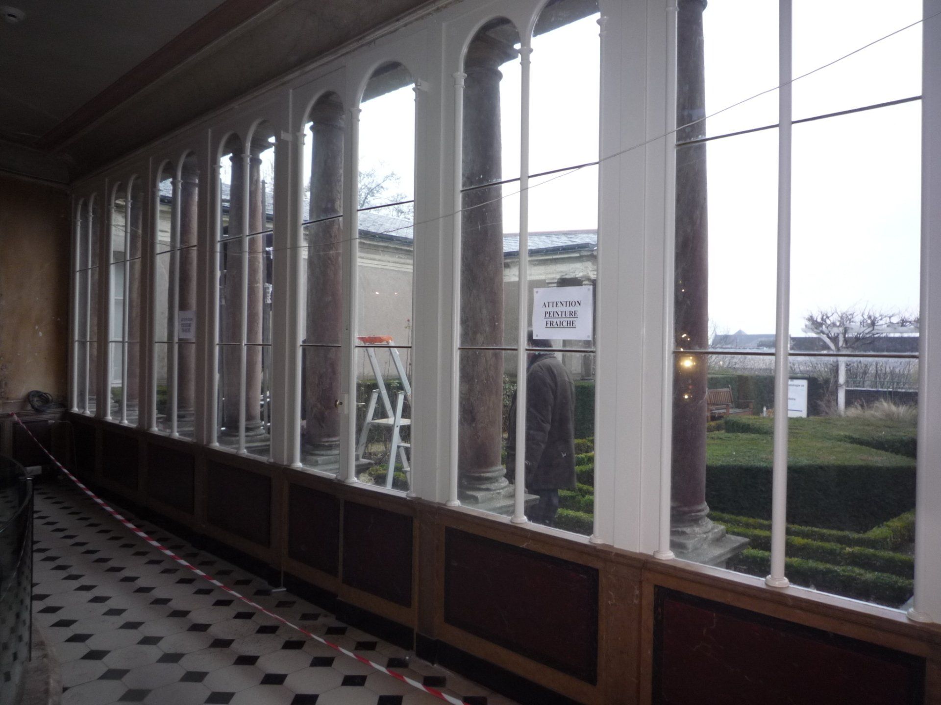 Du fait de leur intérêt patrimonial et de leur état de dégradation, les châssis vitrés ont été déposés pour les restaurer, c’est-à-dire changer les éléments trop altérés, restituer les éléments de modénature disparus (moulure par exemple), revoir les étanchéités et les mastics, réviser les ferrures et remettre en jeu et en teinte…