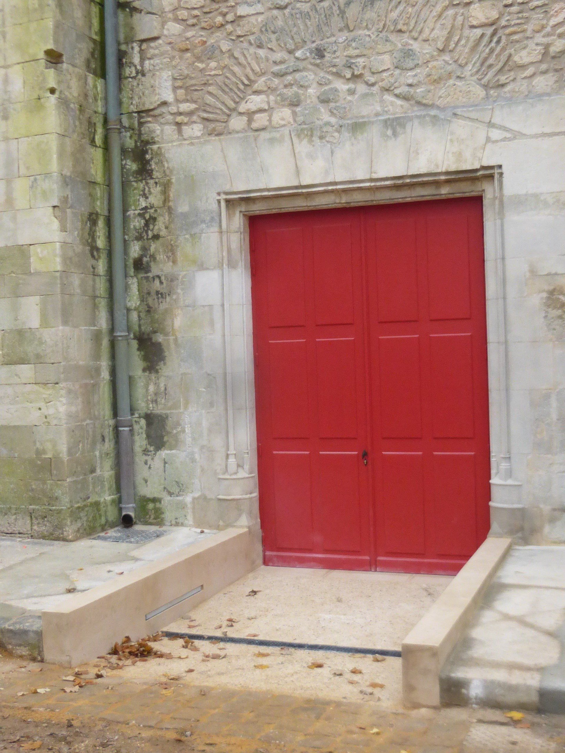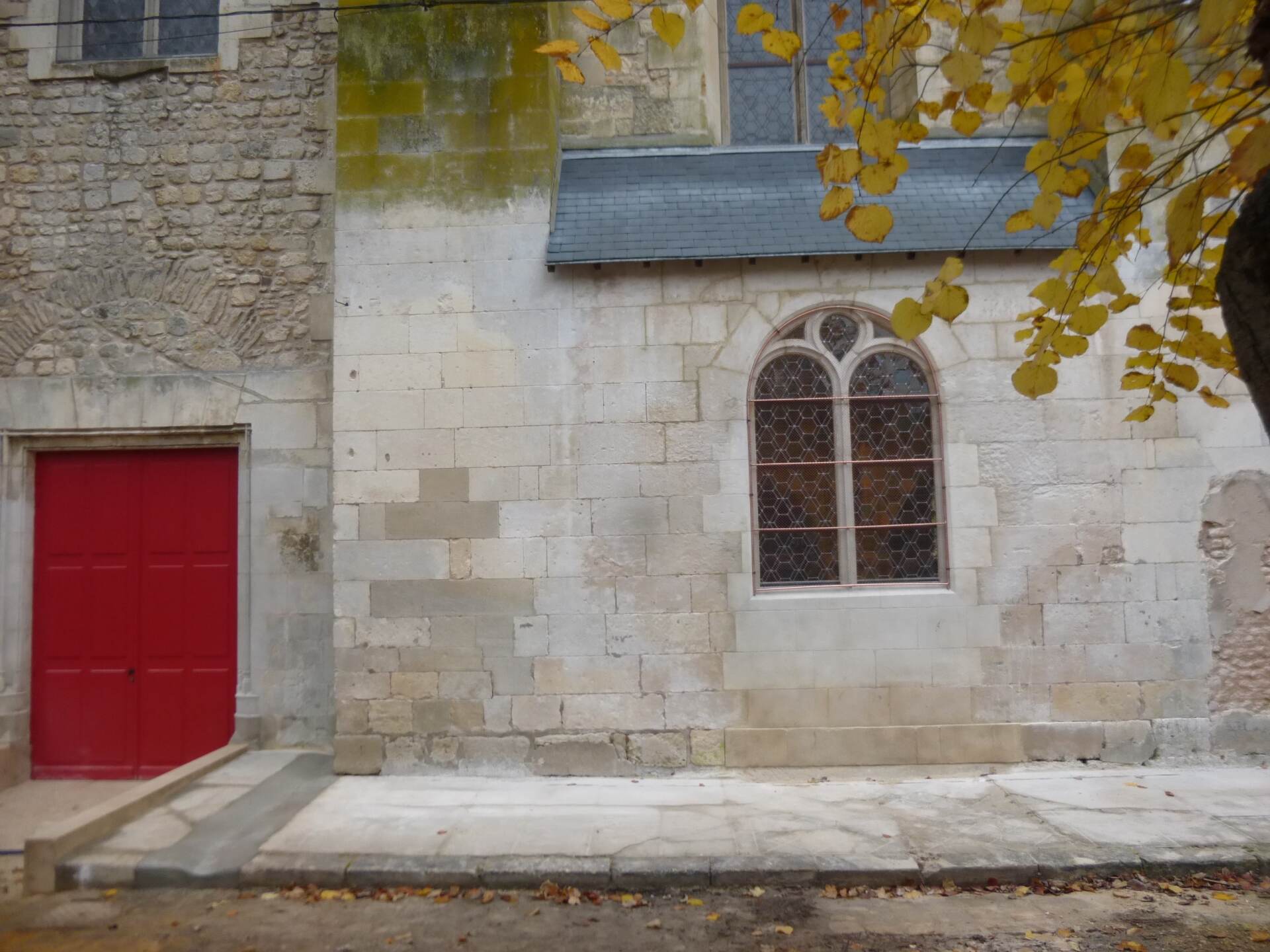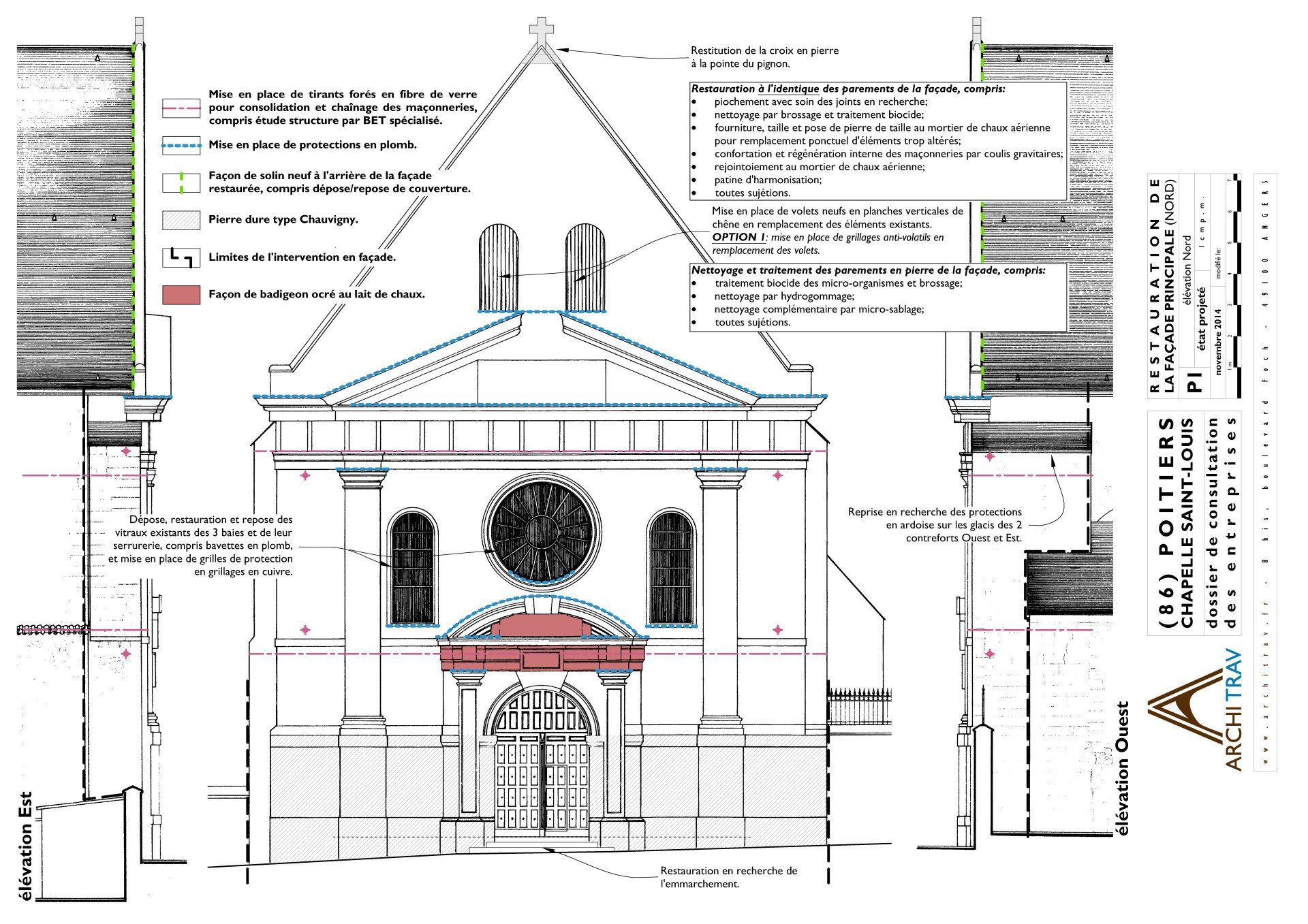 La présente opération réalisée en deux tranches et confiée à sept corps de métiers (maçonnerie, consolidation, nettoyage et traitement de la pierre, charpente-menuiserie, couverture, vitraux-serrurerie et électricité) a porté sur la restauration de la façade principale (tranche ferme) et sur la mise en accessibilité de l’entrée latérale (tranche conditionnelle n°1). Pour cela, une ancienne porte murée a été rouverte et associée à une rampe d’accès, tandis qu’une ancienne baie éventrée pour servir de porte a été restituée en fenêtre et dotée de vitraux.