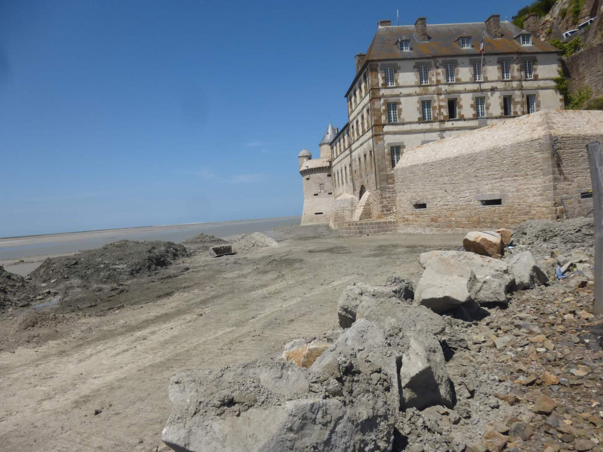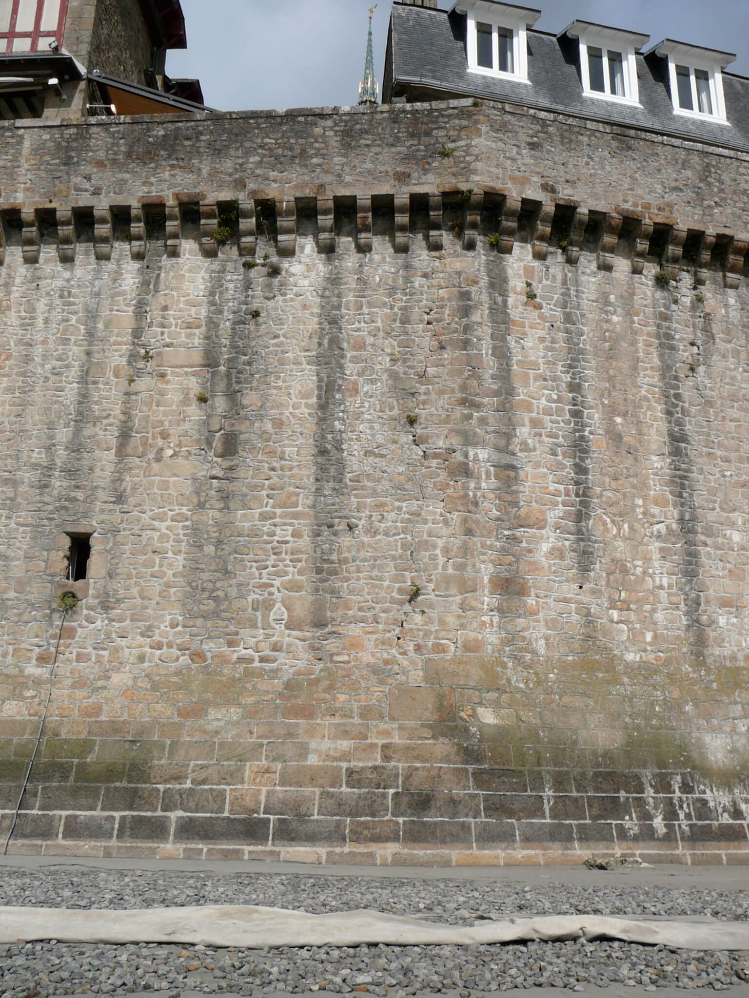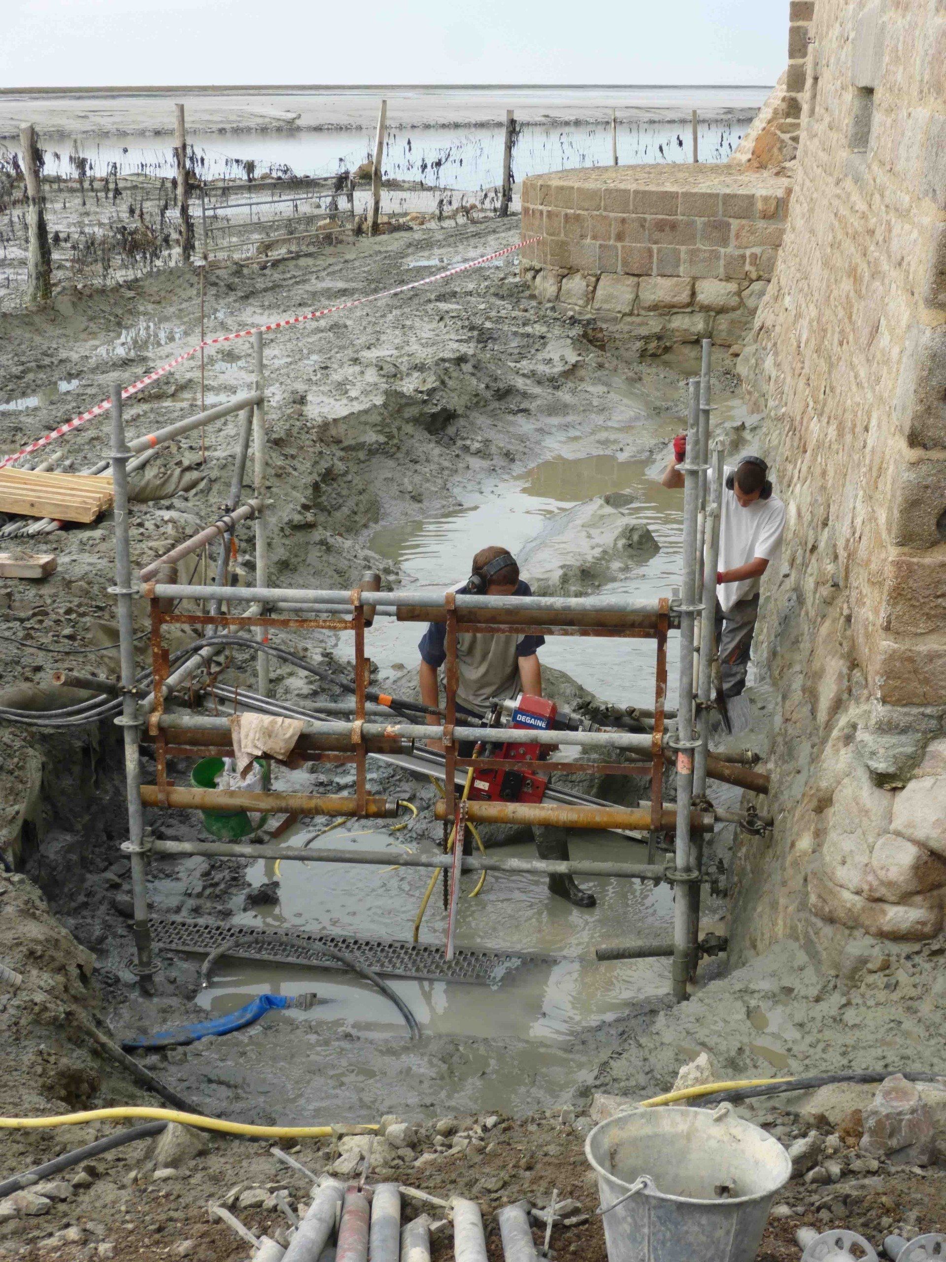 Liés à la réhabilitation du caractère maritime du Mont-Saint-Michel, les travaux de cette opération découpée en deux phases de travaux de chacune quatre tranches ont consisté en la consolidation et la restauration des maçonneries en élévation.