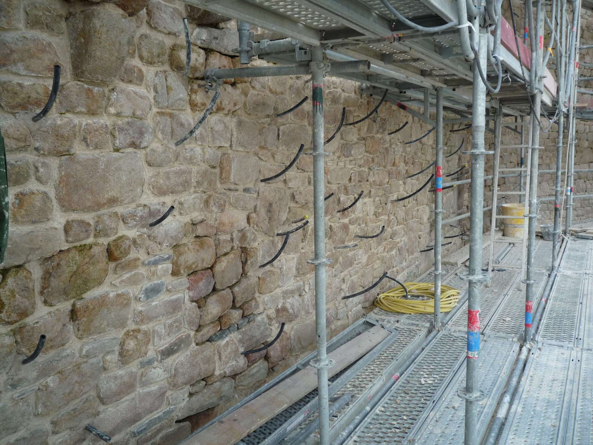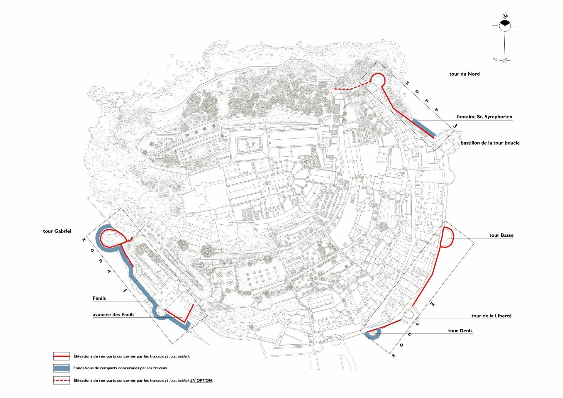 Les travaux ont également porté sur la consolidation des semelles de fondations, suivant les conclusions des sondages du BET, sur la réfection des sols et étanchéités des parapets et des tours, ainsi que sur la réfection des installations électriques, téléphoniques et de sonorisation.