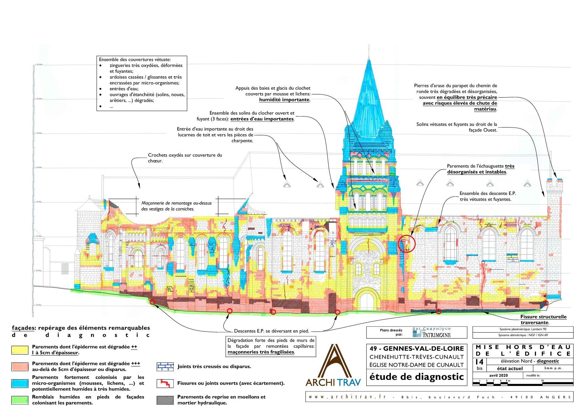 Les travaux préconisés consistent en des travaux de reprise à l’identique comme les changements de pierre défectueuse, de nettoyages de parements, de consolidations de charpentes, de reprises de couvertures, d’assainissements… Certaines dispositions récentes n’étant pas justifiées, nous avons également proposé des traitements architecturaux plus en accord avec l’histoire et l’archéologie du monument.