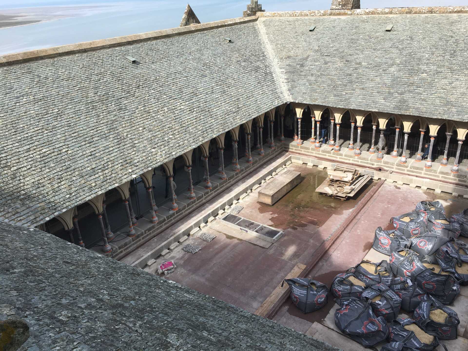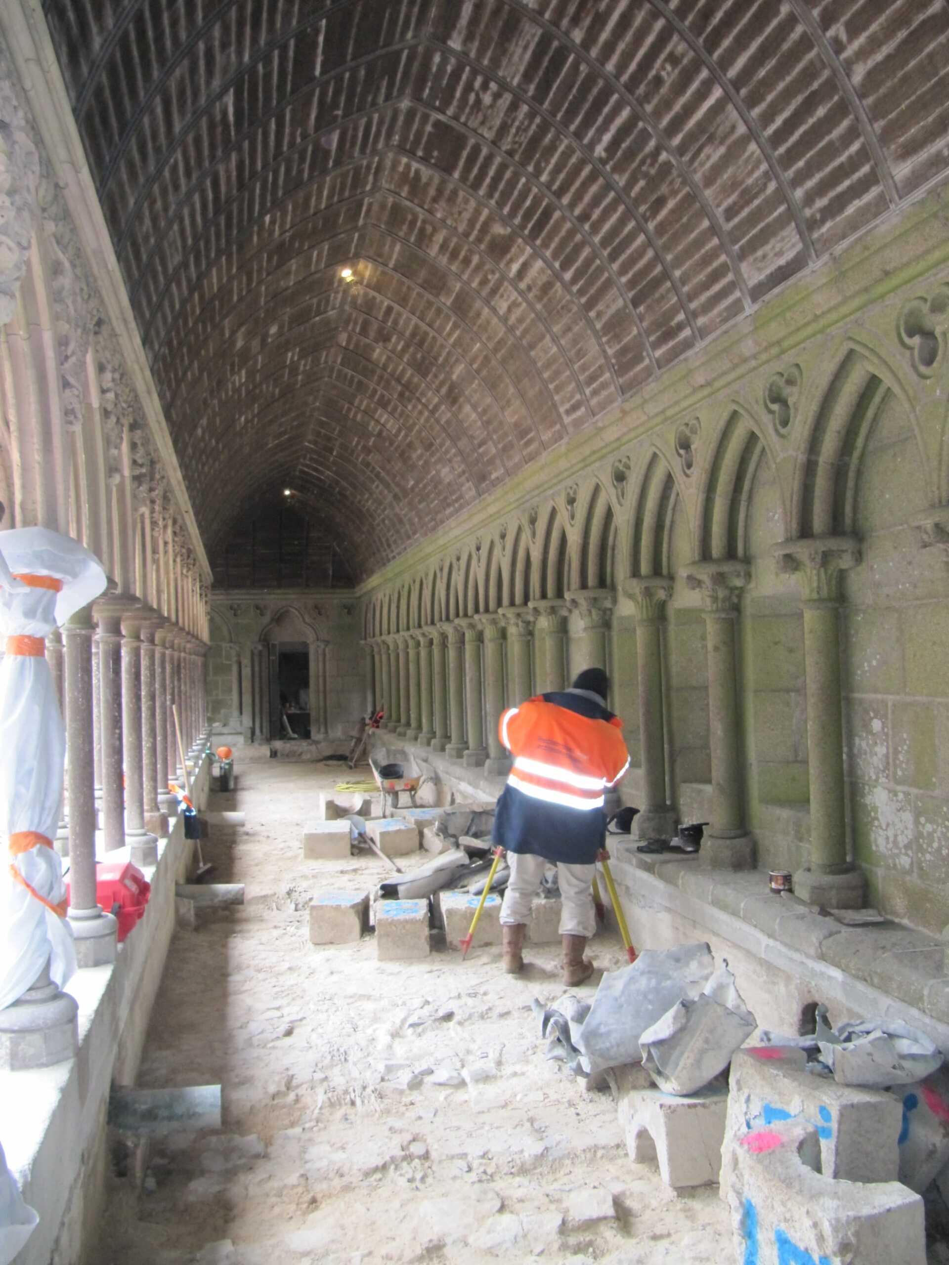 Construit au sommet de la partie occidentale de la « Merveille », nom donné communément aux bâtiments réguliers construits au nord de l’église abbatiale, le cloître du Mont-Saint-Michel est un des édifices emblématiques de l’occident chrétien. Sa localisation en bord de mer et sa position au nord en font un édifice particulièrement sensible à l’humidité saline.