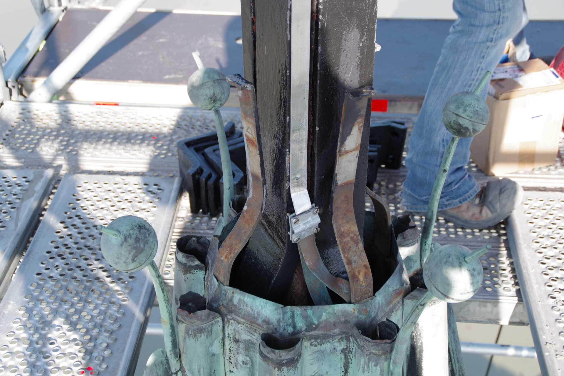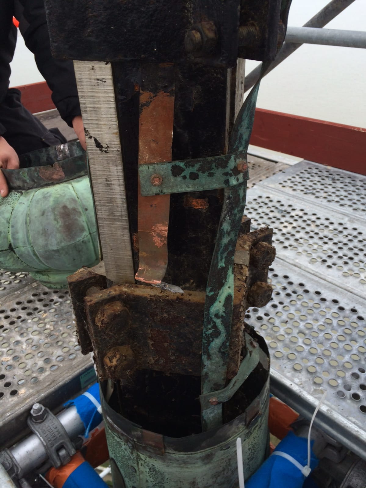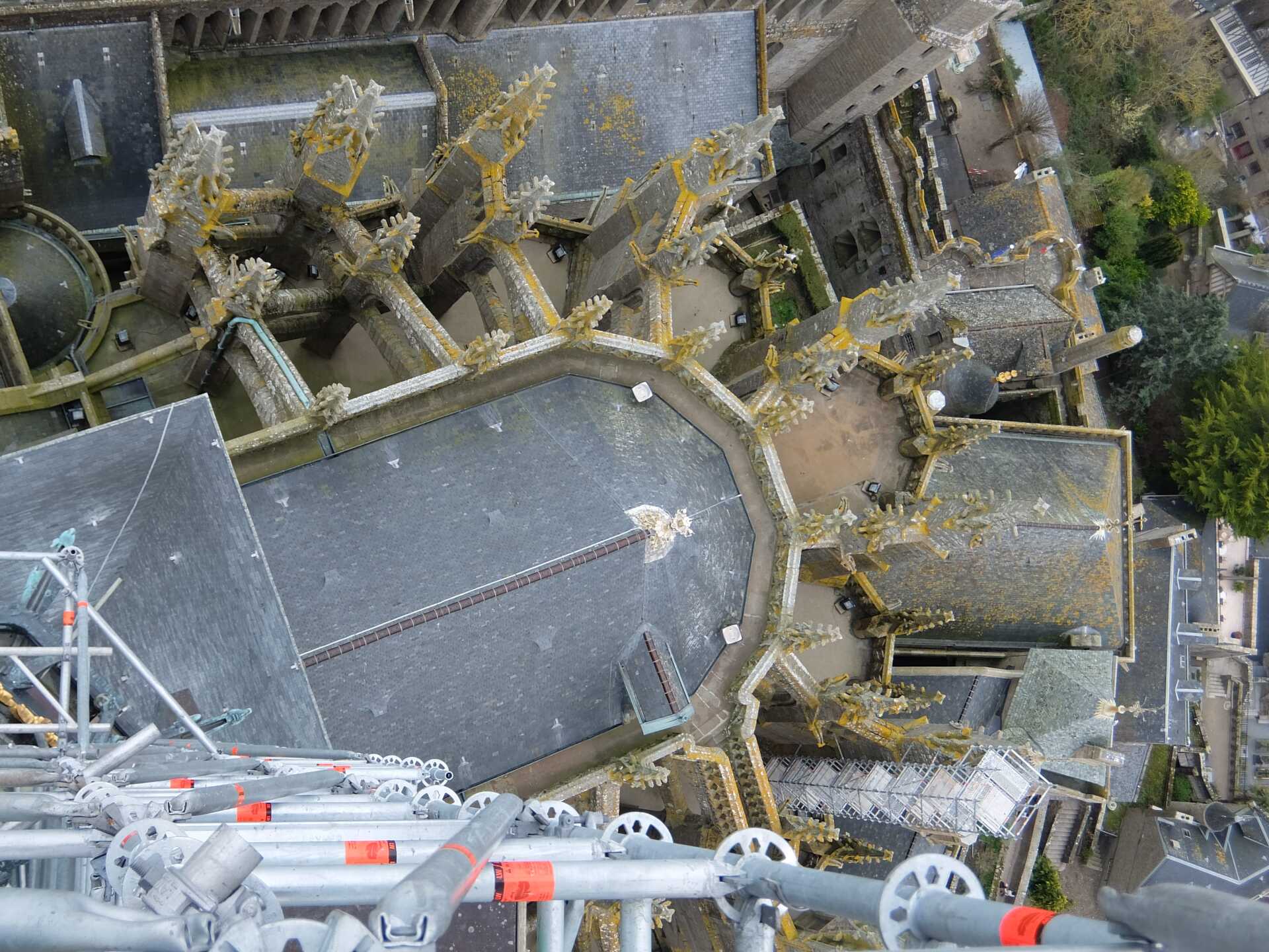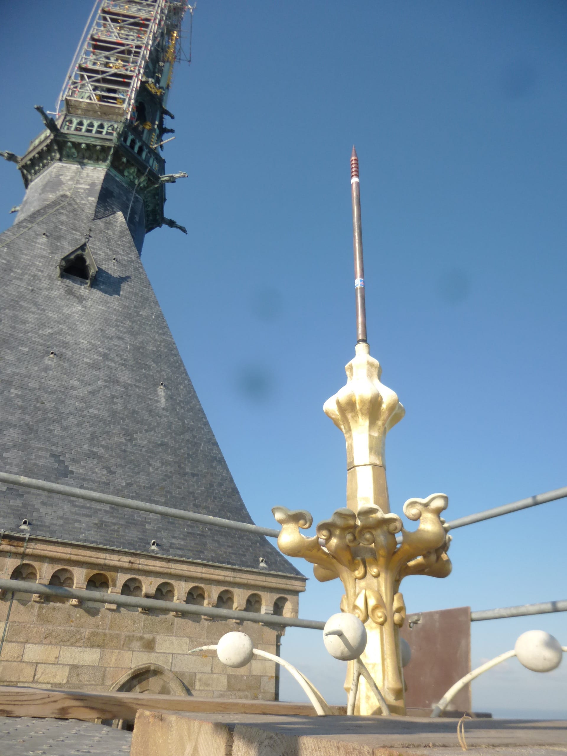 L'opération consistait à réviser complétement les 25 pointes de capture passive réparties sur les bâtiments qui composent l’abbaye, l’élément culminant se trouvant en haut de la flèche, à la pointe de l’épée de l’Archange, ainsi que tous les conducteurs et les prises de terre.