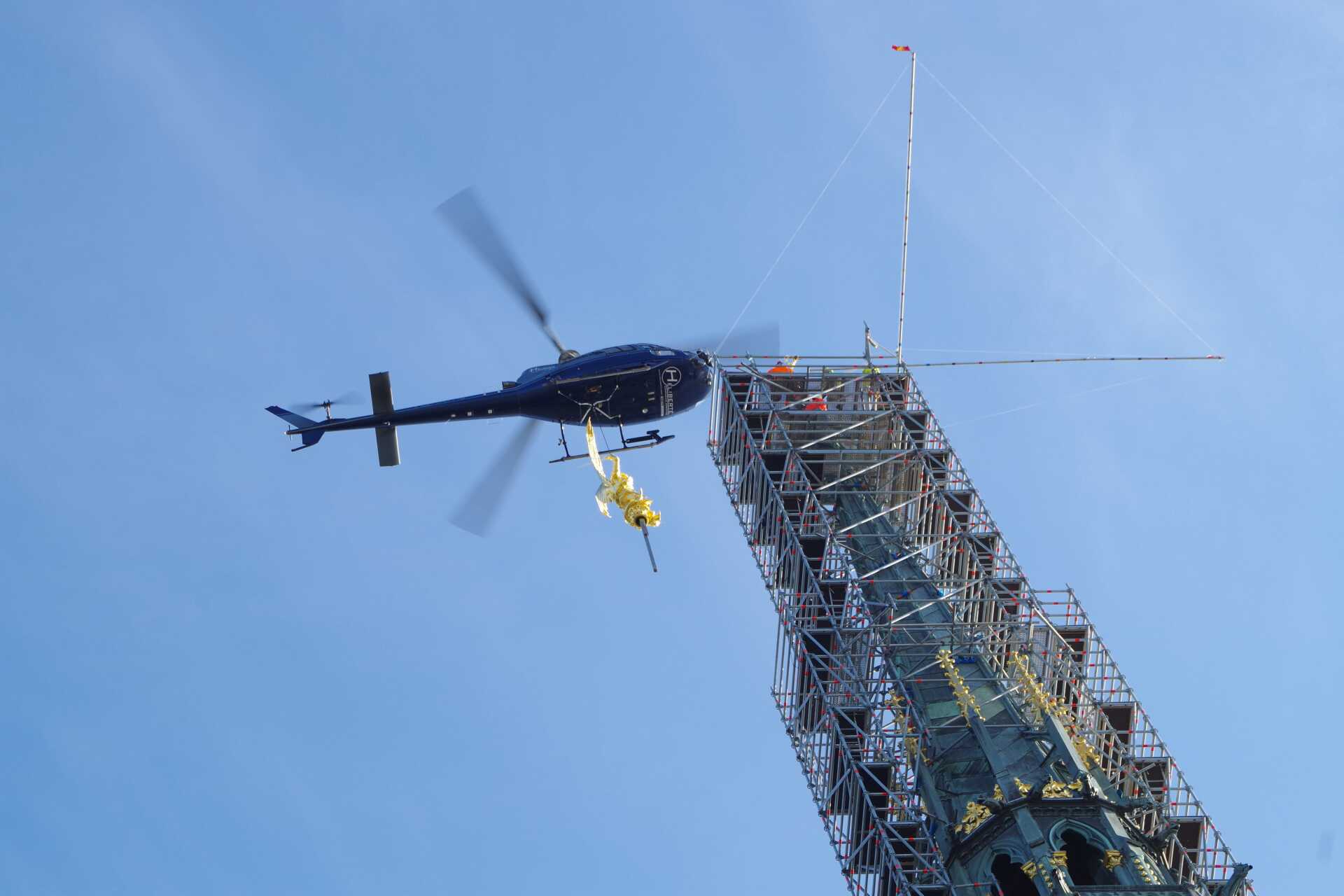 Nous avons profité de cette intervention au plus haut du monument pour refaire la dorure de la statue, laquelle datait de 1987 et était passablement dégradée. Cela nécessitait la dépose de l’Archange. Restauré et redoré, l’archange a été remis en place par hélitreuillage, retrouvant la flèche du Mont le 26 mai 2016, culminant à 156 m de haut au-dessus de la mer.